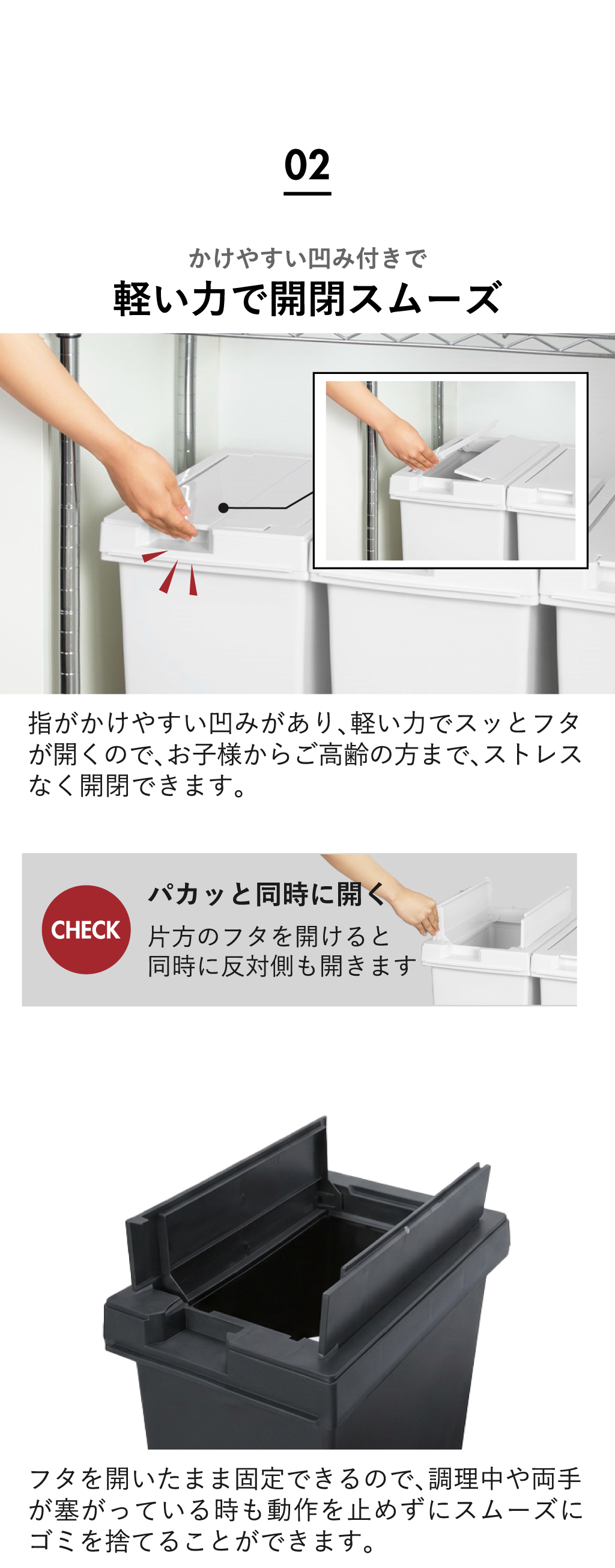 さらにフタは開いた状態で固定できるため、調理中や両手がふさがっている時でも家事効率がアップします。