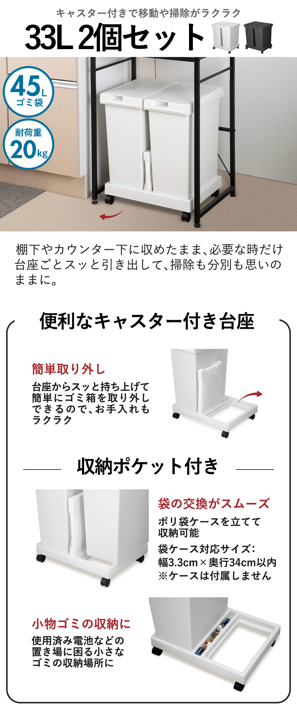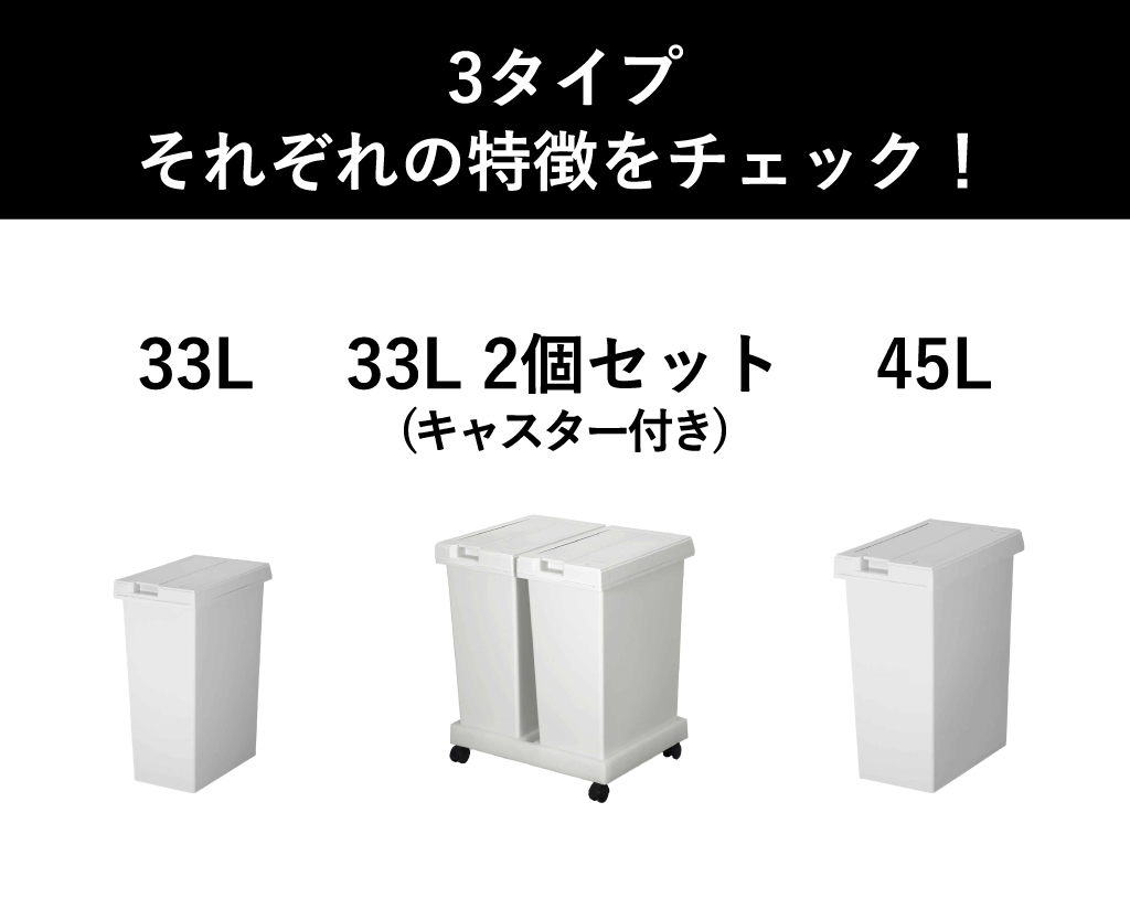 33Lと45Lの2サイズ展開で容量や置き場所に応じて、キッチンやリビングで活躍します。