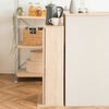 木板の素材は、撥水性、耐水性に優れた塩化ビニル貼りのパーティクルボードです。汚れや水濡れも拭き取ってきれいにすることができ、キッチンに最適です。角は丸く、面取り加工も施され、安心してお使いいただけます。