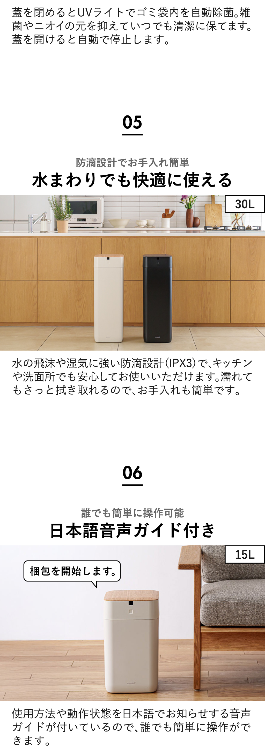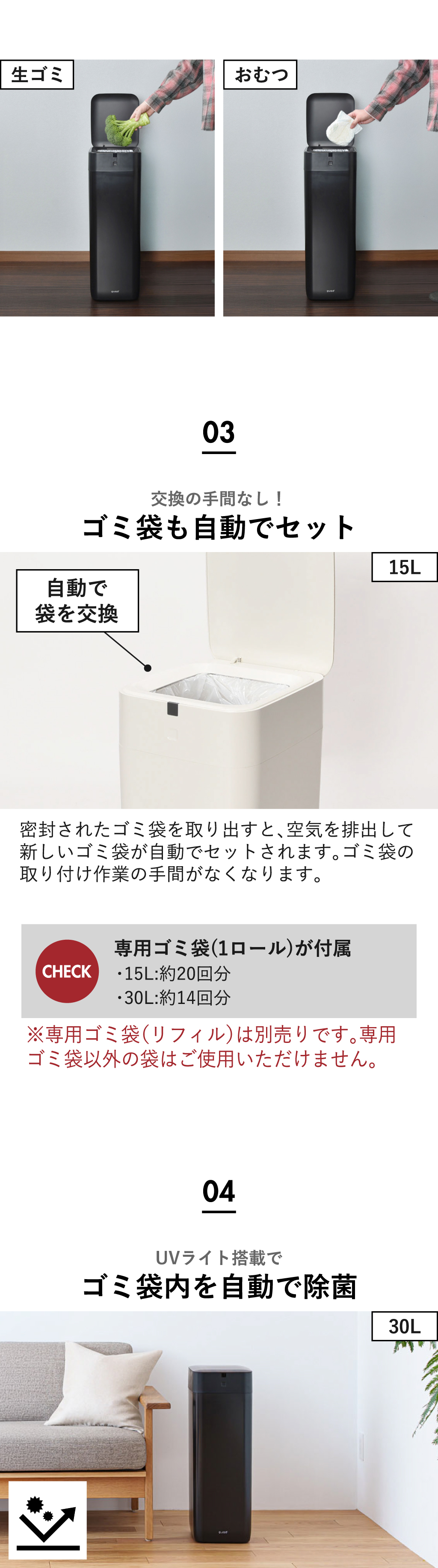 また、ボタンを2秒長押しするだけで、ゴミに触れずに熱溶着技術で袋を完全密閉。