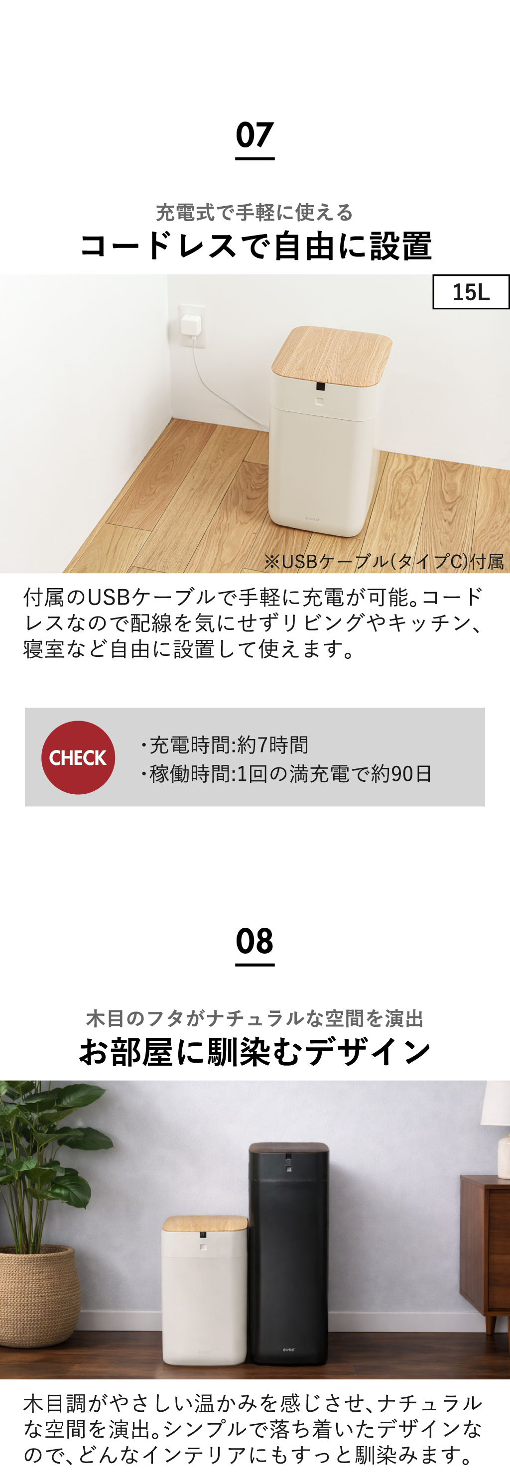 自動開閉式ゴミ箱は、充電式だから付属のUSBケーブルで手軽に充電が可能。