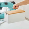 天然木のフタであたたかみのある雰囲気に。フタを裏返せばトレーとしても活用できるので、ボタンや糸などの一時置きにぴったり。テーブルの上がすっきりして、針仕事もスムーズに行えます。