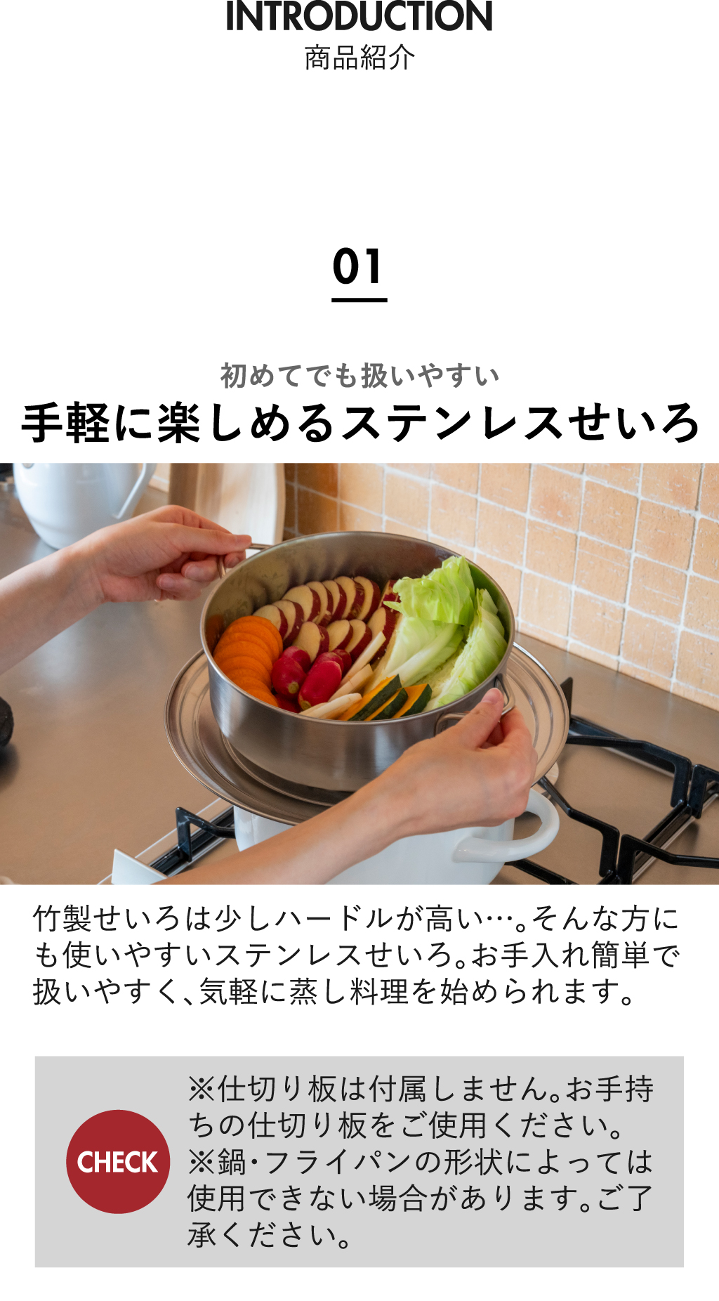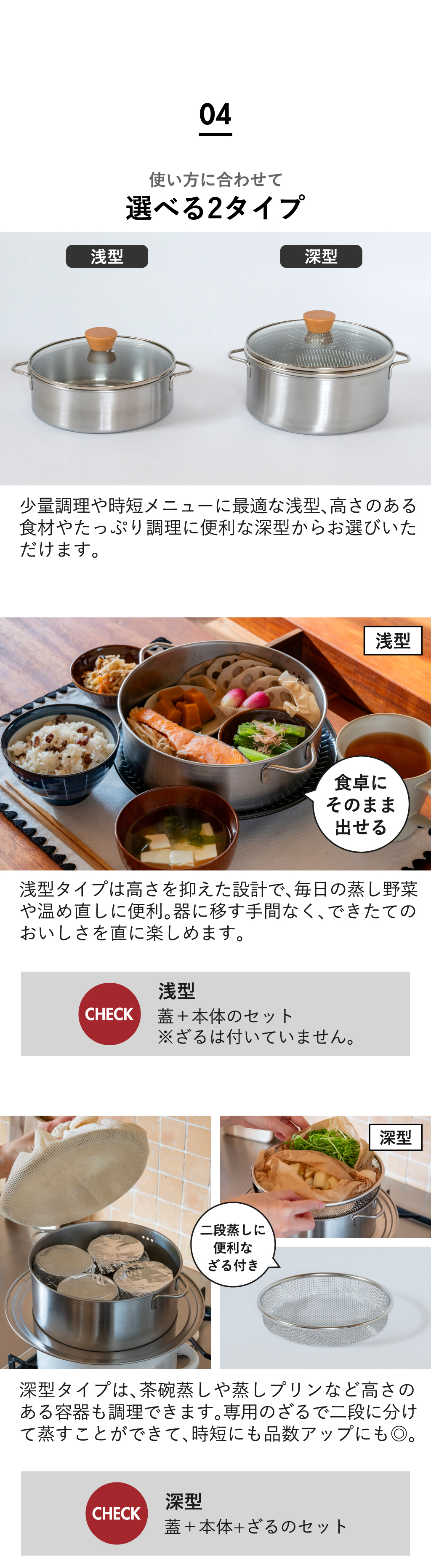 用途に合わせて選べるのも、このせいろ蒸し器鍋セットの特長です。