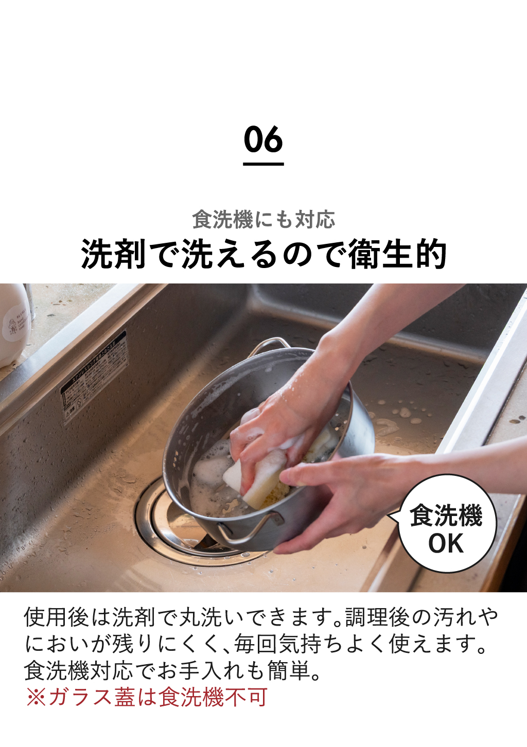 使用後は洗剤を使って丸洗いでき、ガラス蓋を除いて食洗機にも対応しています。