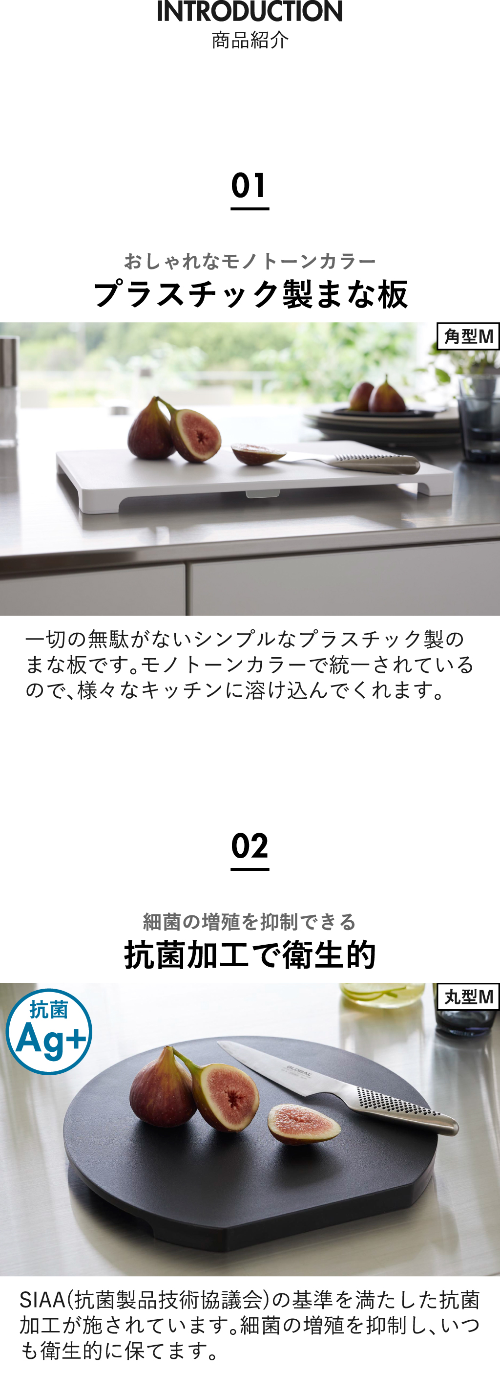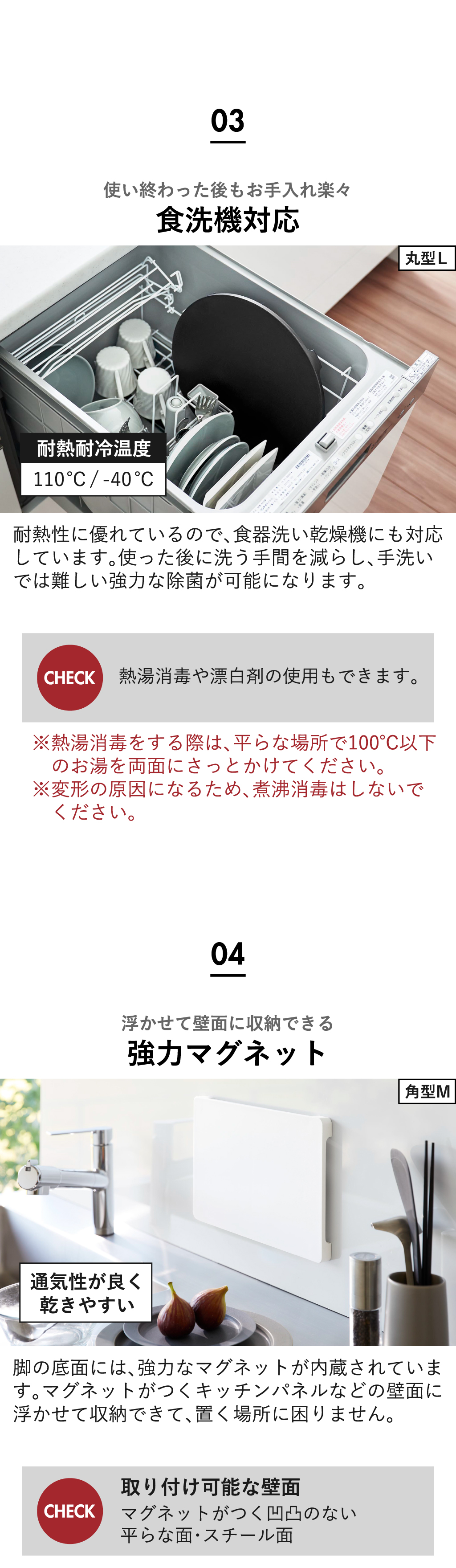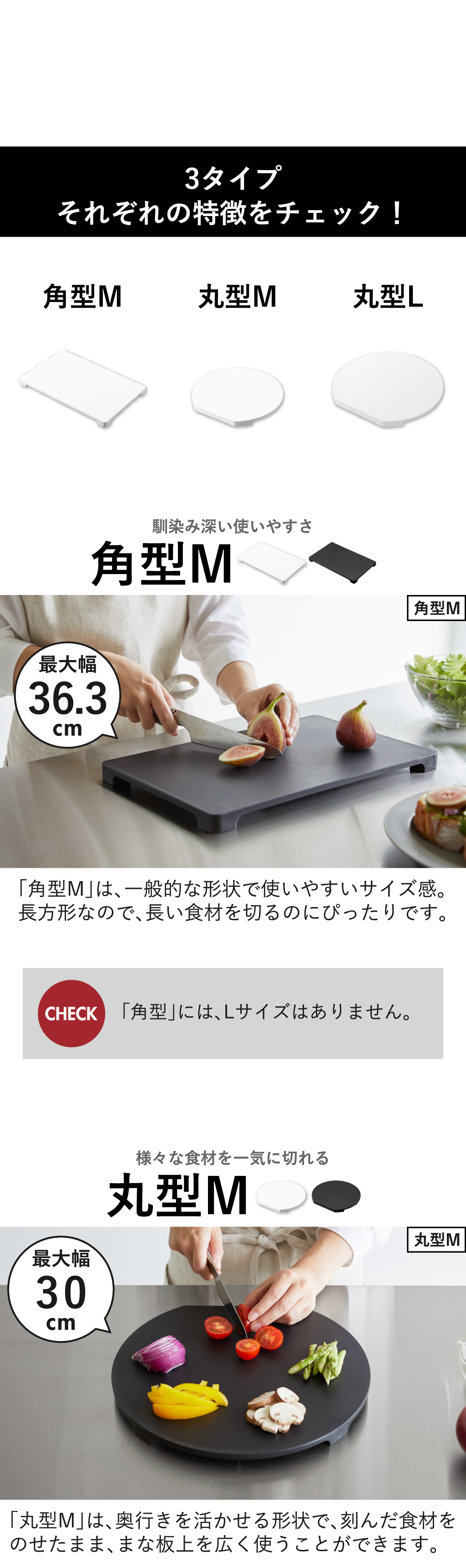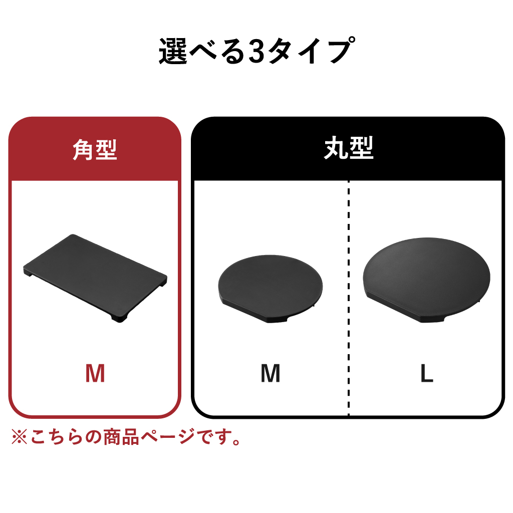 食洗機対応まな板は、「角型M」「丸型M」「丸型L」の3タイプからお選びいただけます。