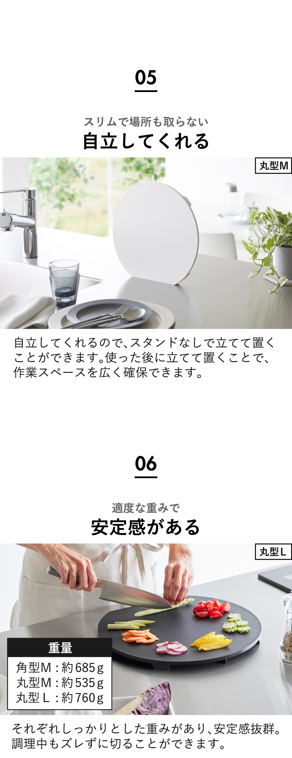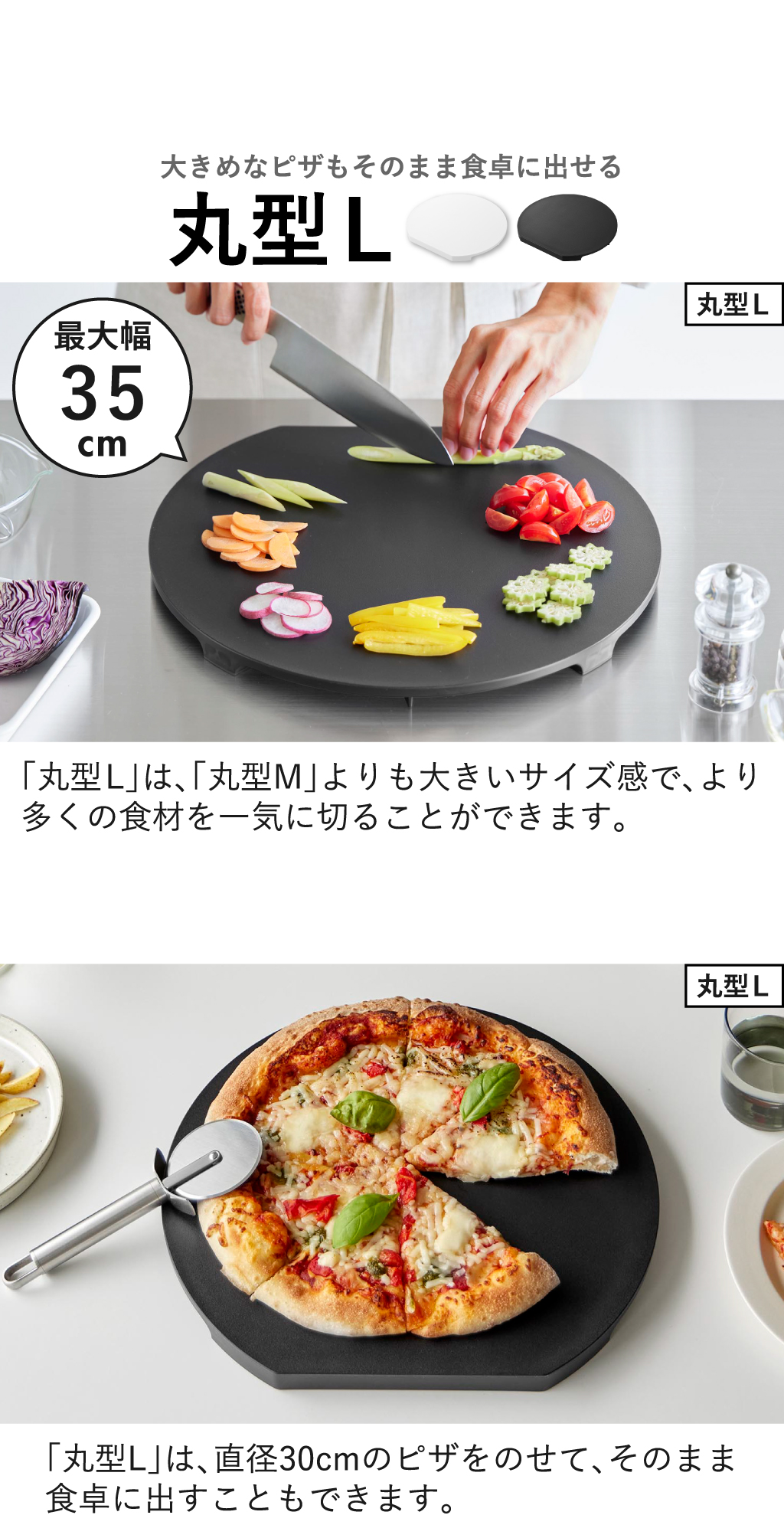 「丸型L」も同じくかまぼこ型で、より多くの食材をのせることができる食洗機対応まな板。