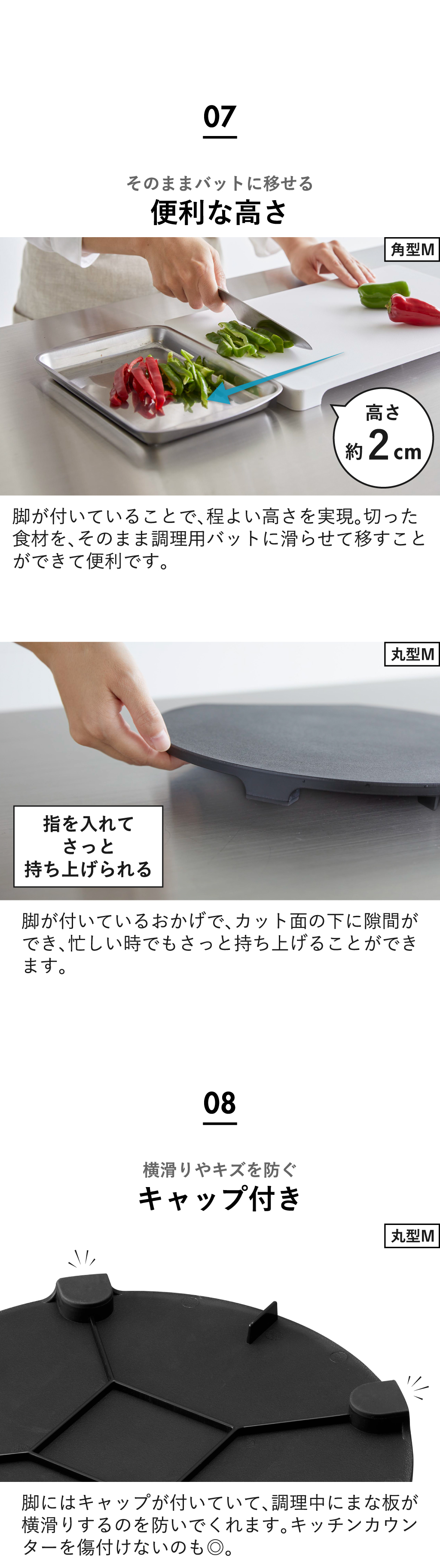 脚が付いていることで、程よい高さを実現。切った食材をそのまま滑らせて移せます。
