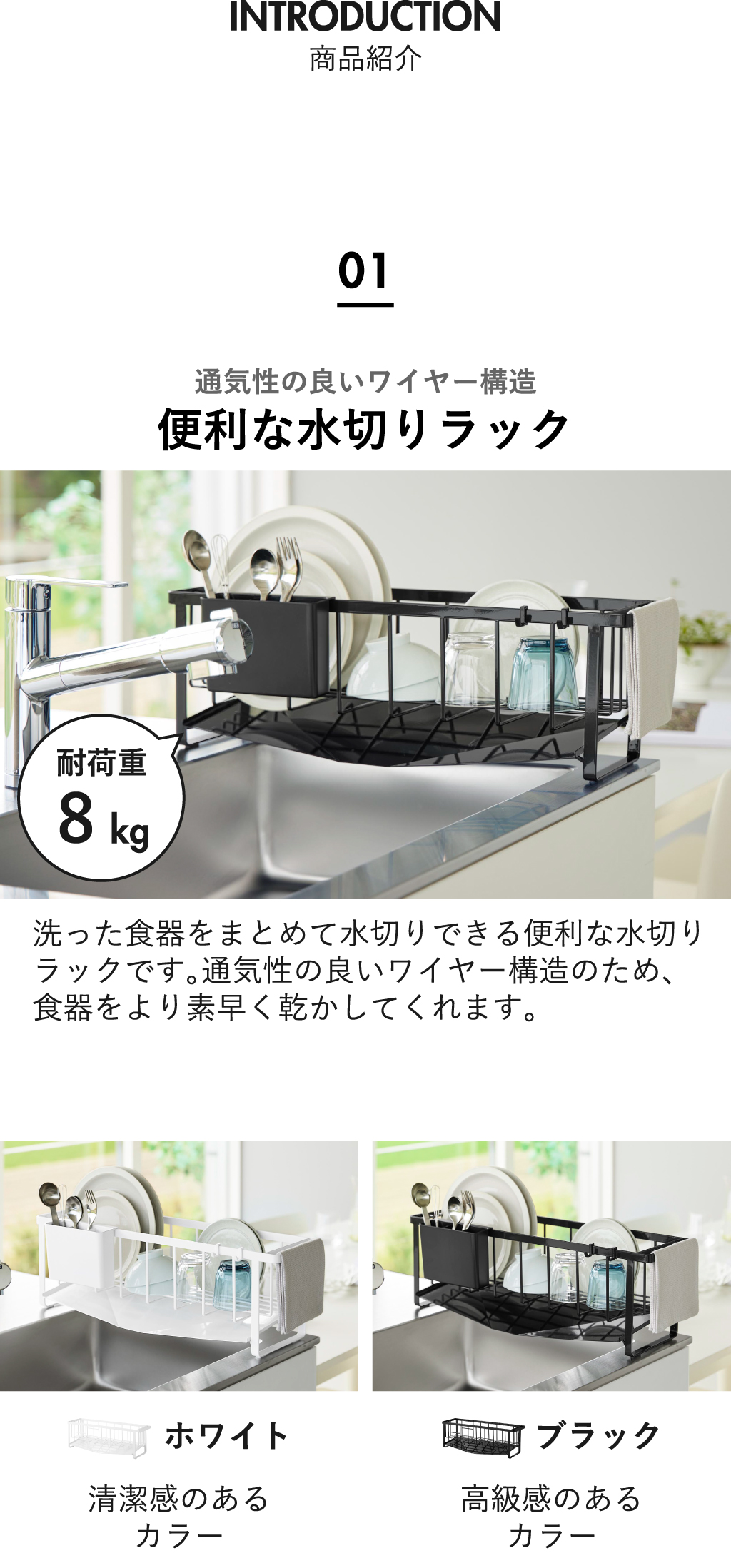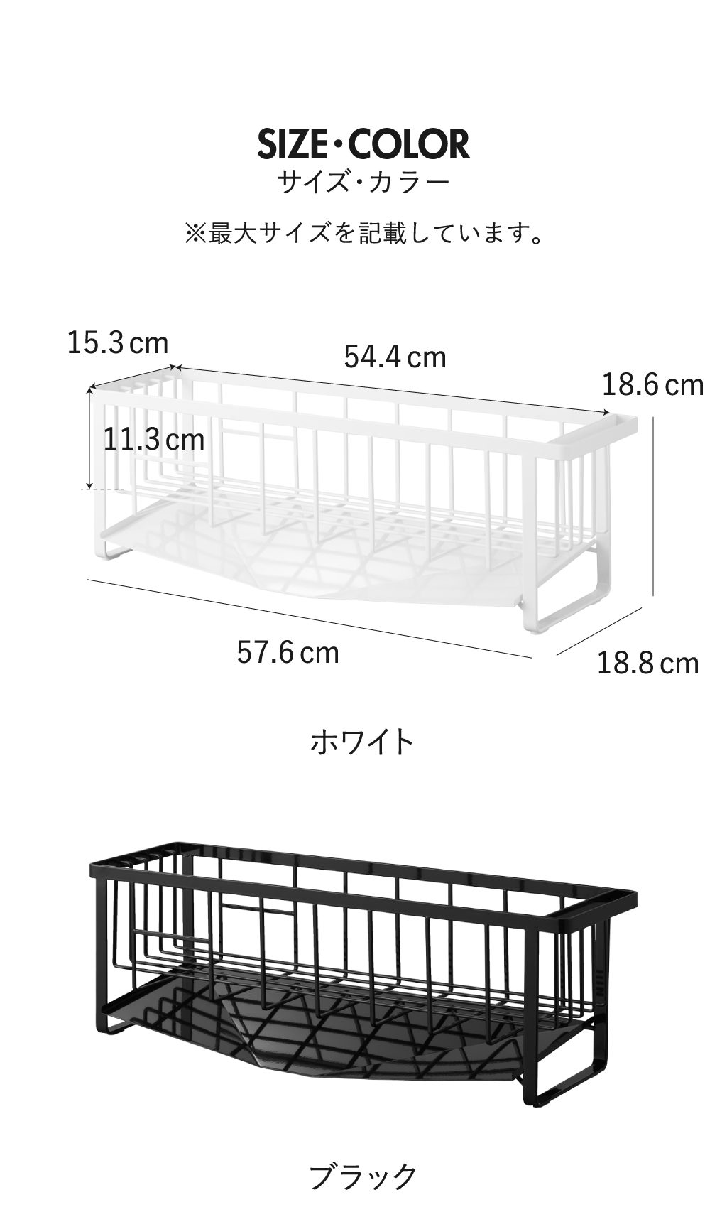 シンク上スリム水切りラックの色は、ホワイトとブラックの2色展開です。