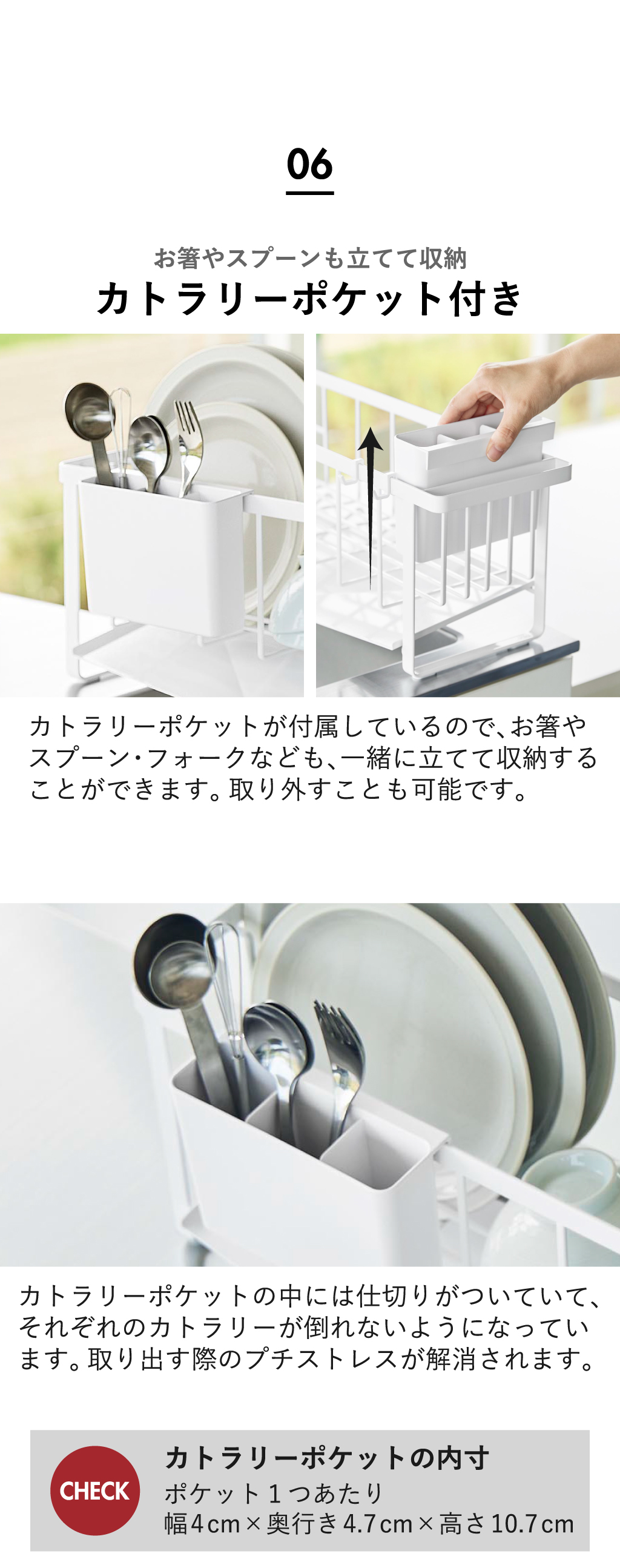 カトラリーポケットが付属しているので、お箸やスプーンなども一緒に立てて収納可能。
