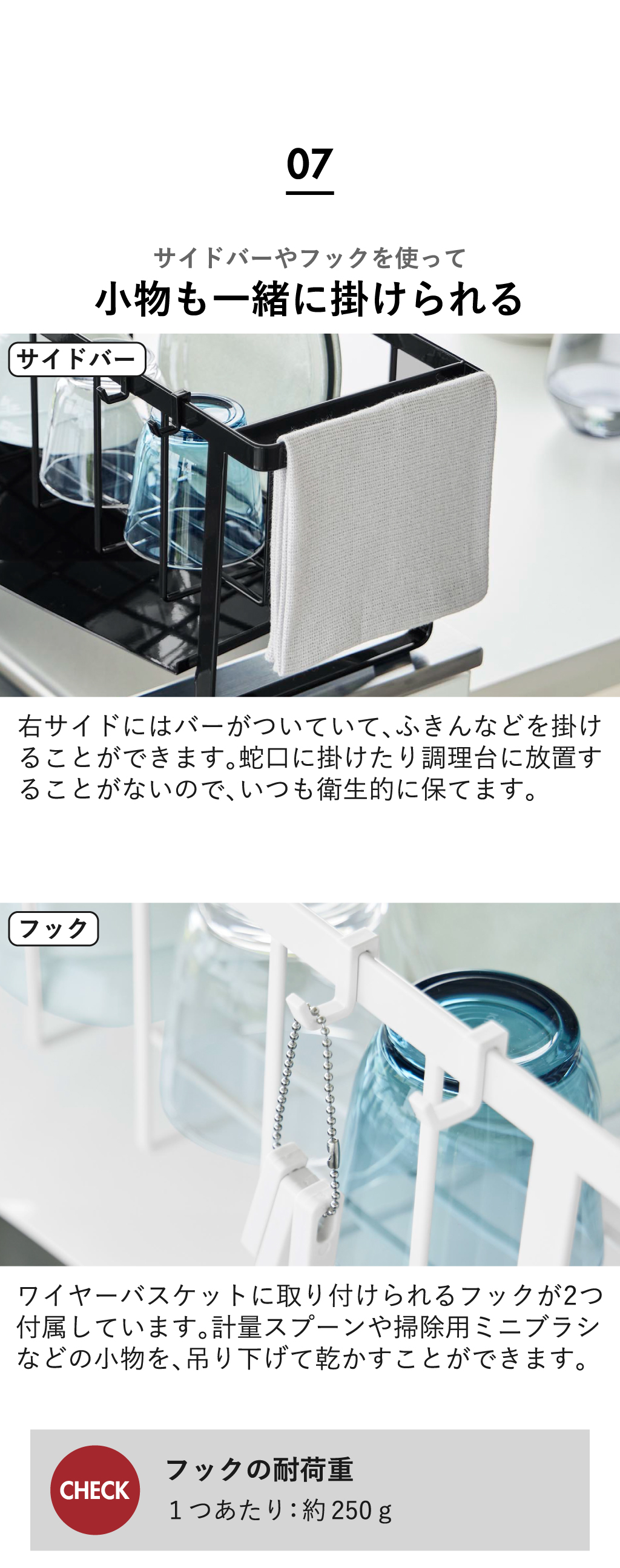 付属のフックを取り付ければ、計量スプーンなどの小物を吊り下げて乾かせます。