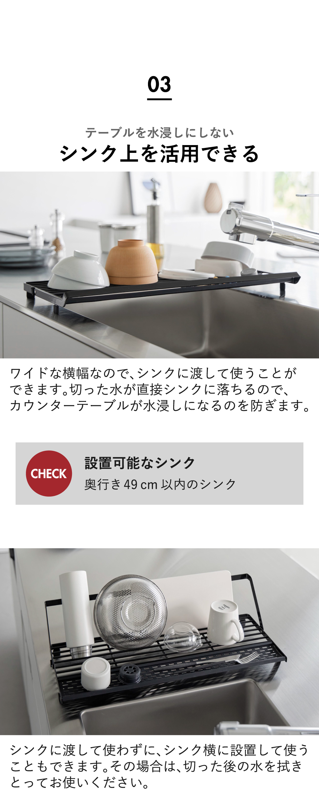 シンク上スリム水切りラックの横幅はワイドなので、シンクに渡して使うことができます。