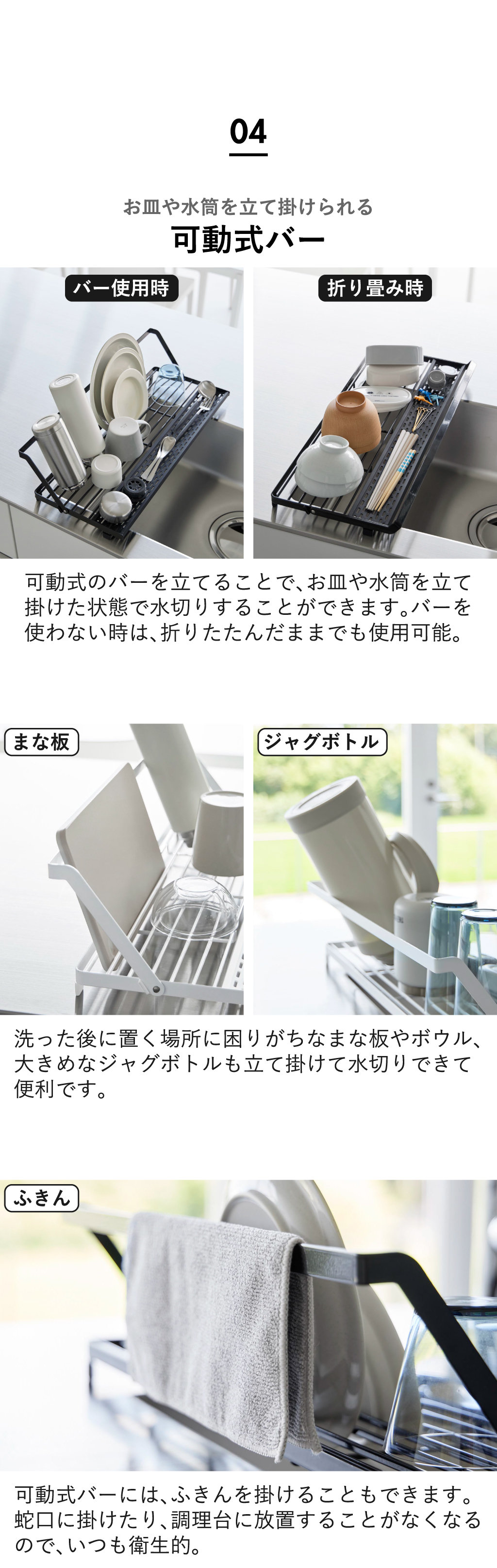 置き場に困りがちなまな板やボウル、大きめなジャグボトルも立て掛けて水切りできます。