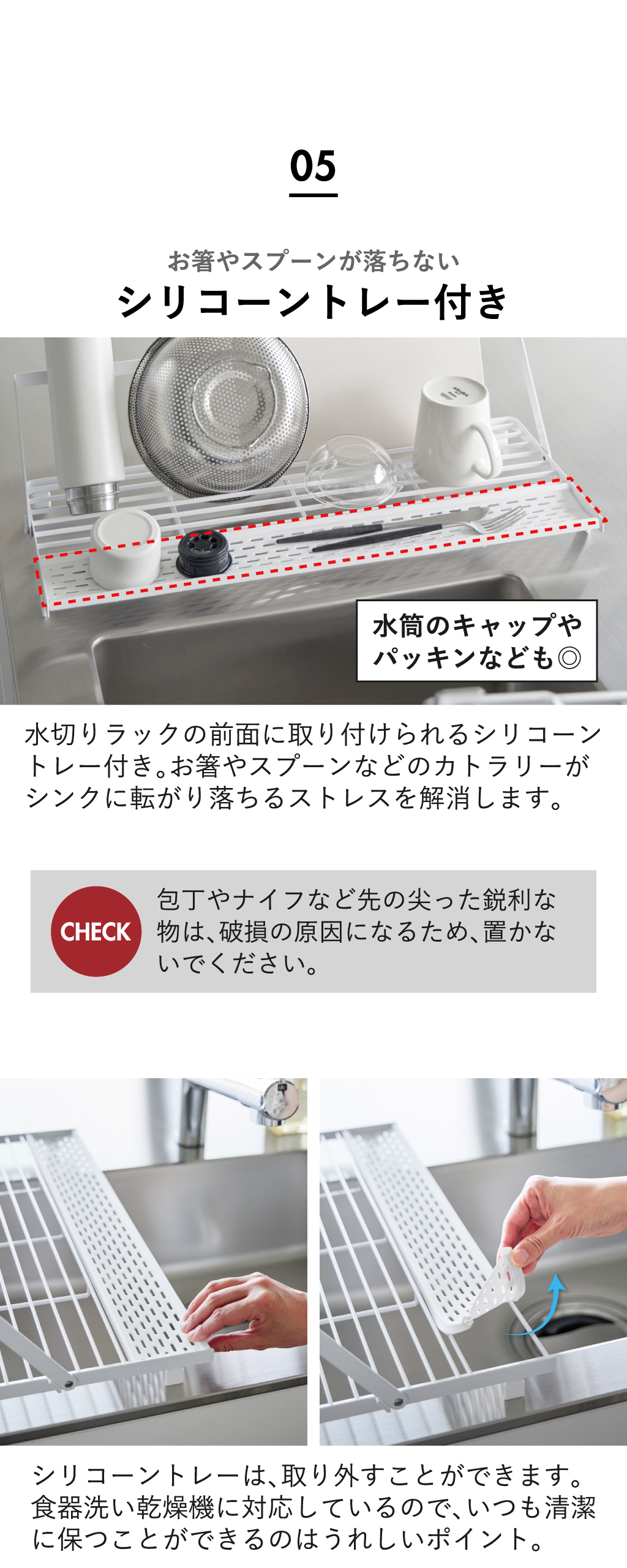 お箸やスプーンなどのカトラリーが、シンクに転がり落ちるストレスを解消してくれます。