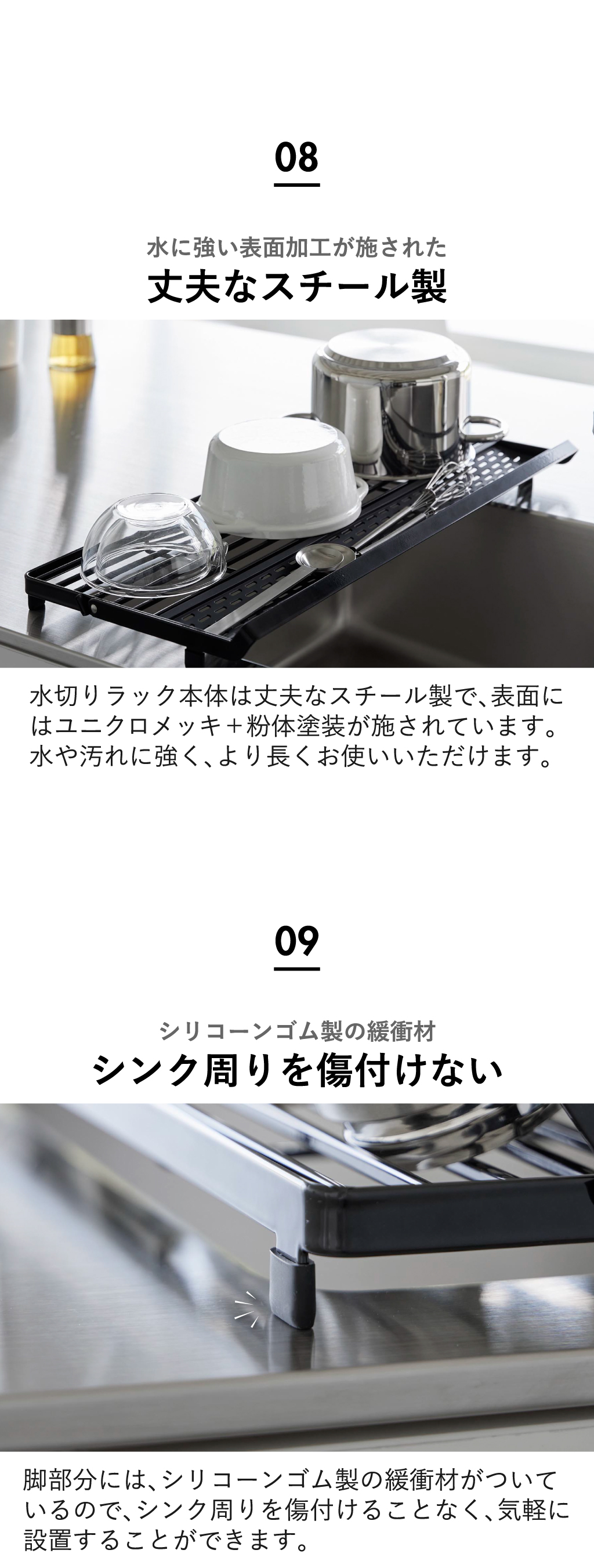 丈夫なスチール製で、水や汚れに強いユニクロメッキ+粉体塗装の加工が施されています。