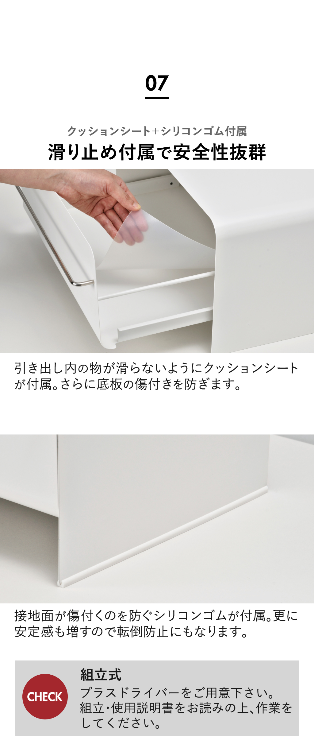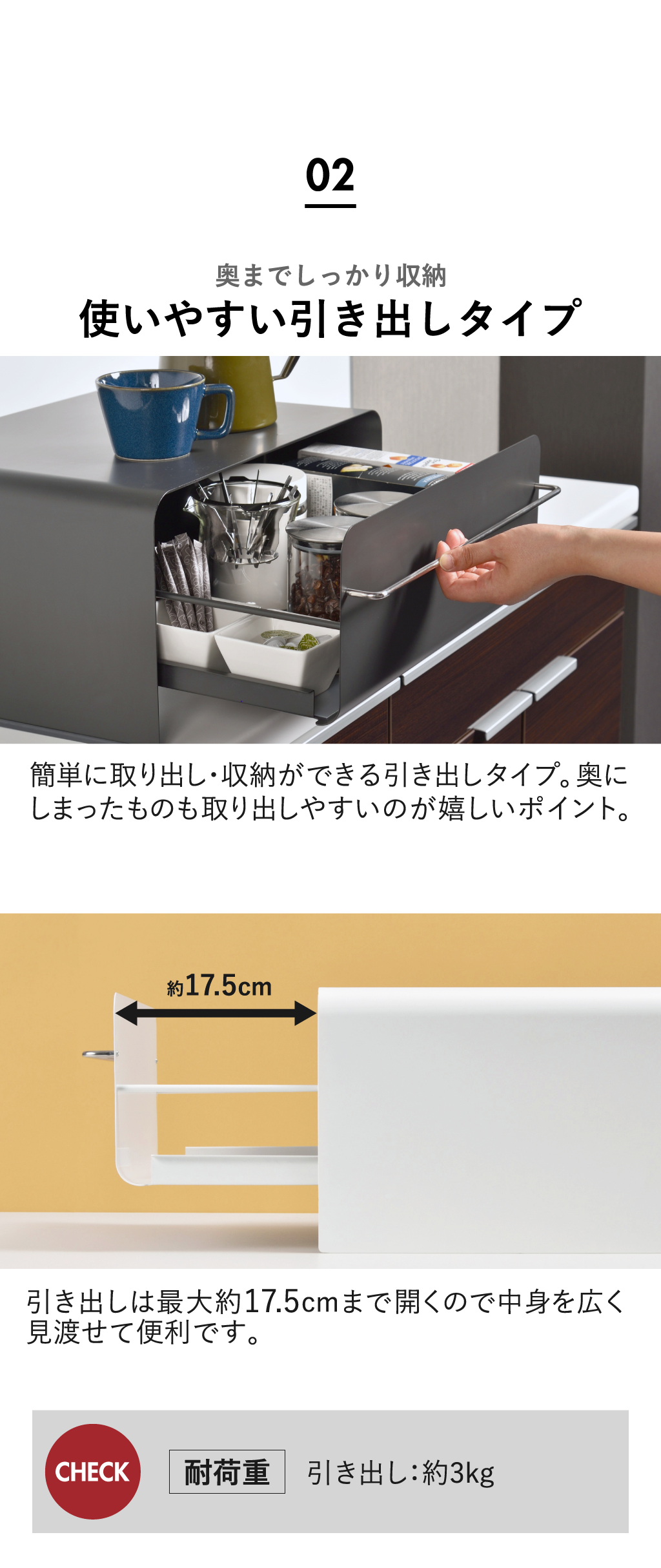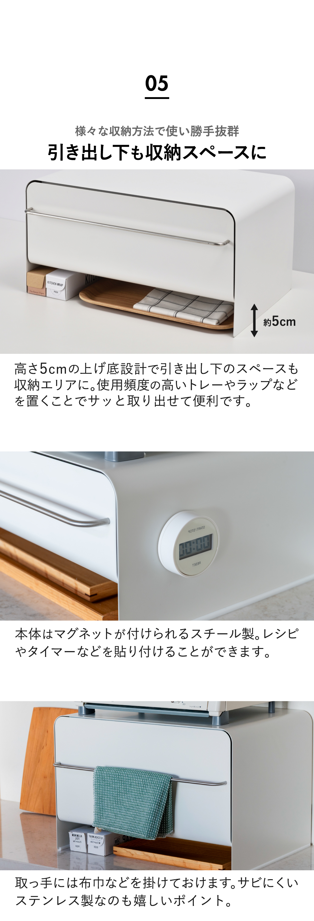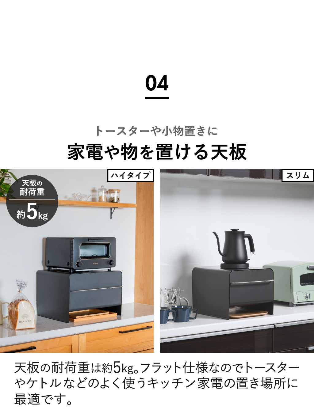 引き出し収納としての完成度が高く、上にトースターを置ける省スペース設計も魅力。