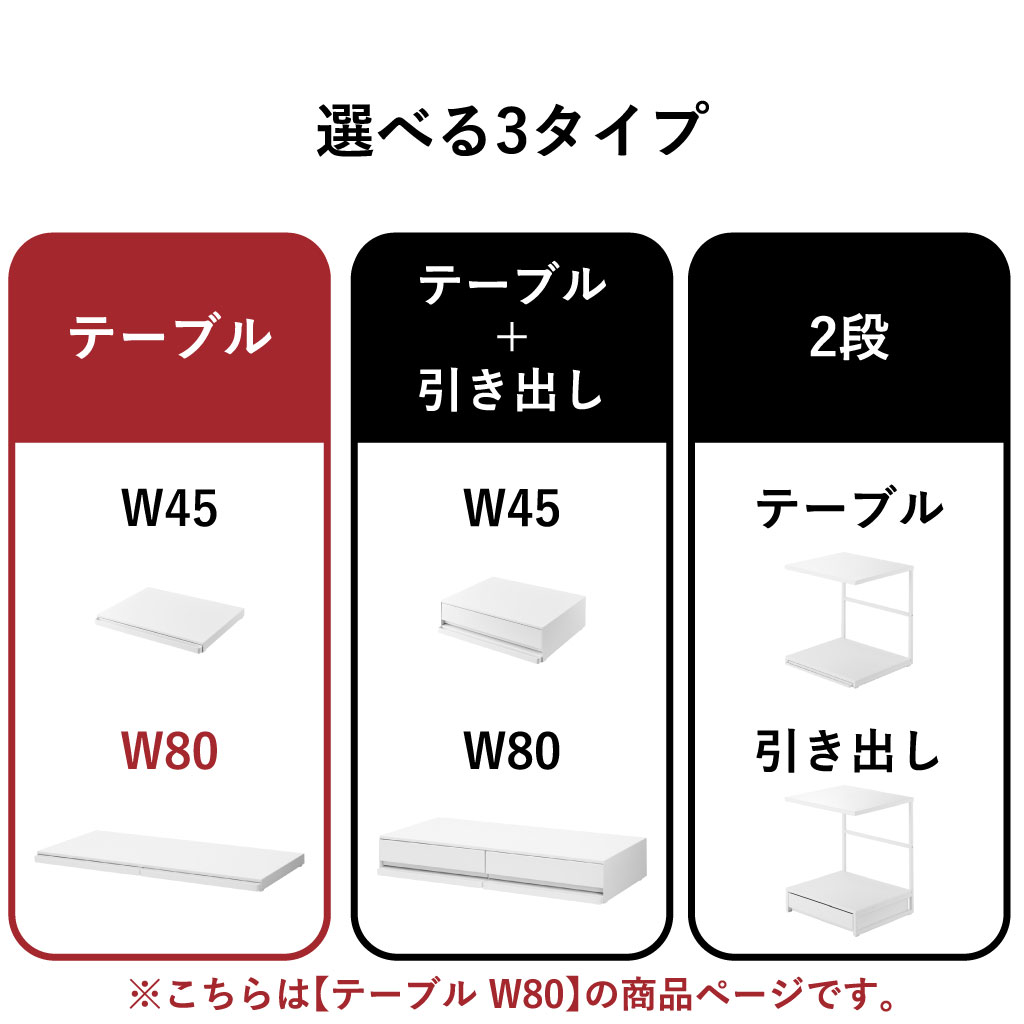 「テーブル」タイプと「テーブル+引き出し」タイプの幅は、コンパクトな「W45」とワイドな「W80」をご用意しました。