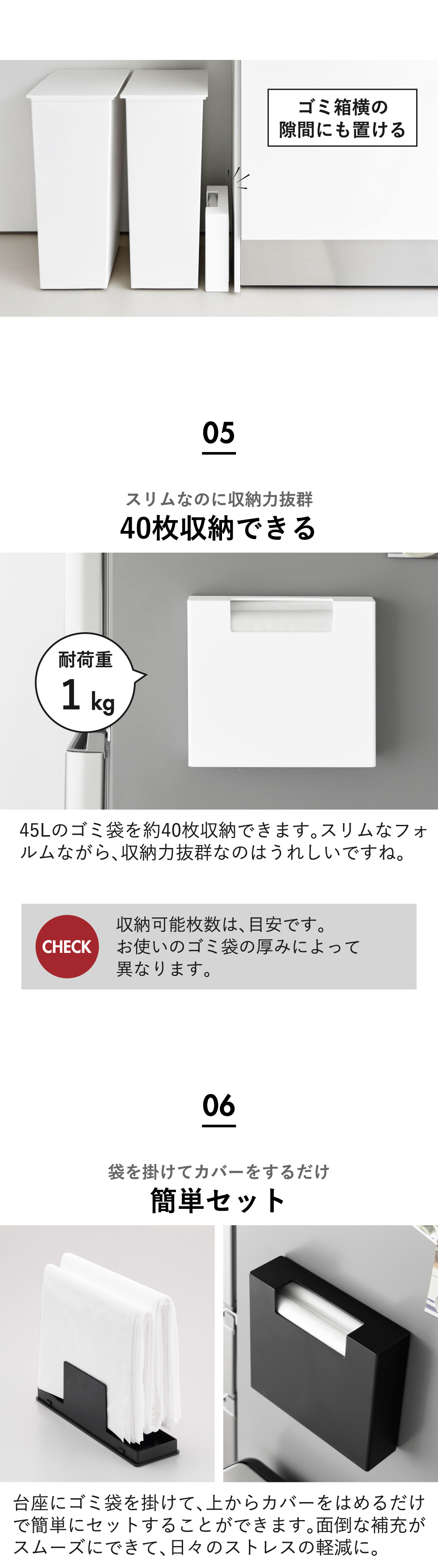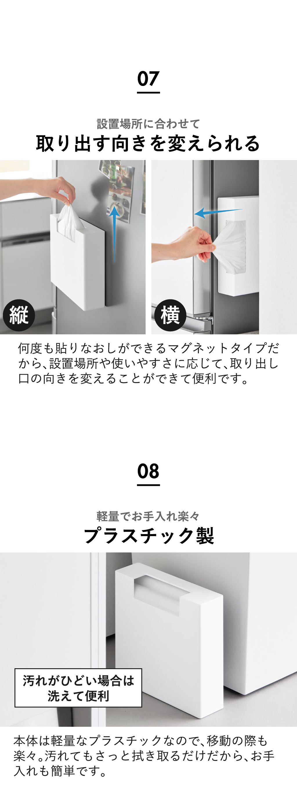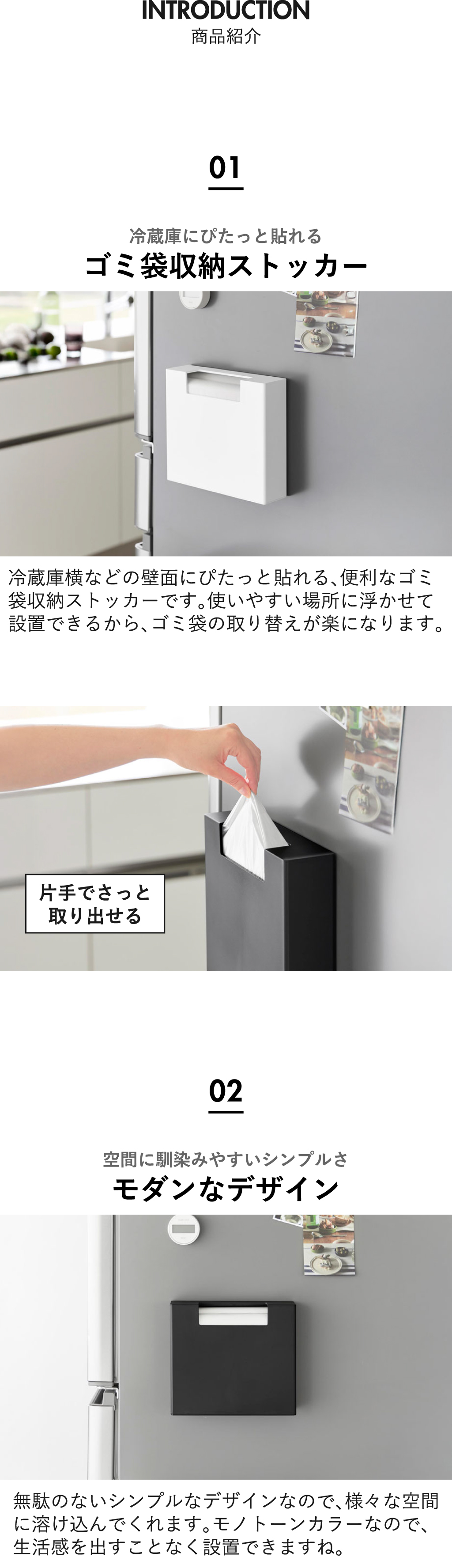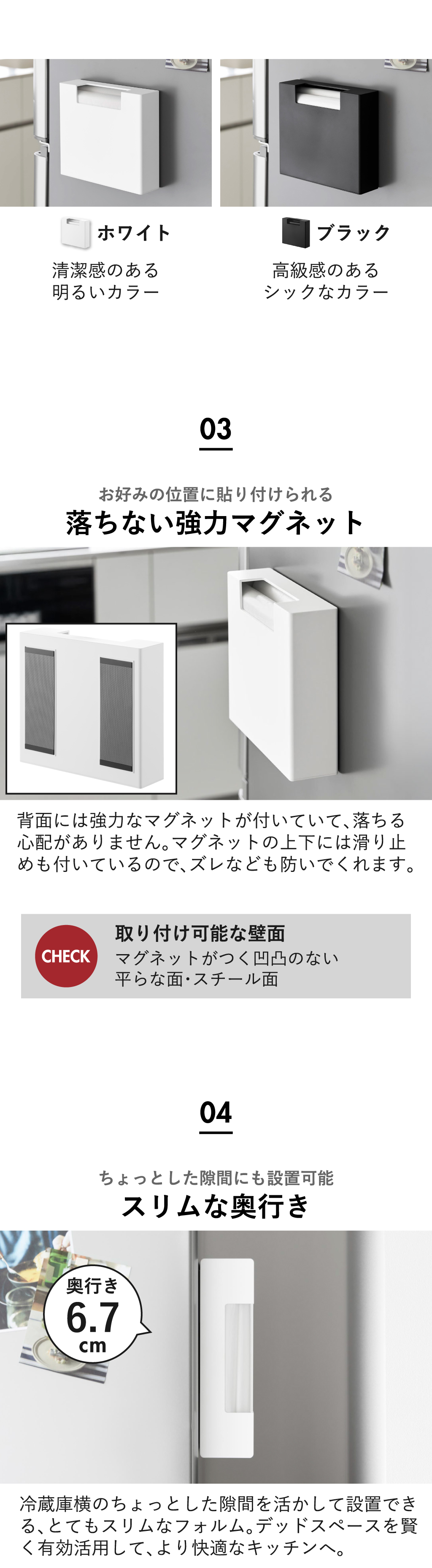 冷蔵庫横などの壁面にぴたっと貼れる、便利なマグネット付きゴミ袋収納ストッカーです。