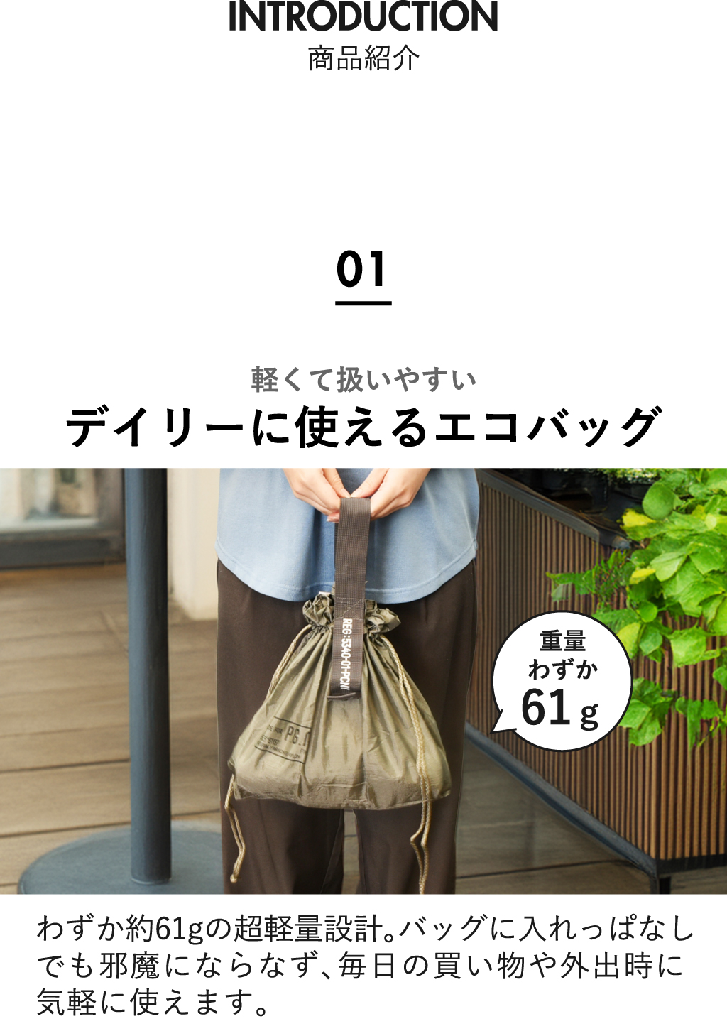 約61gの軽量設計で、バッグに入れても邪魔にならず、毎日持ち歩けるエコバッグ。