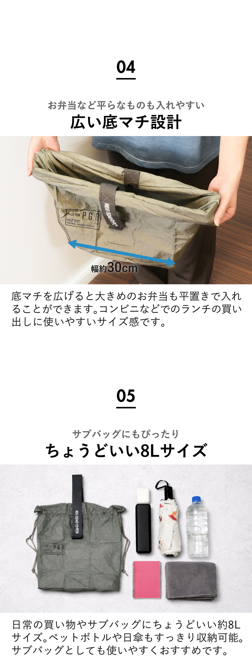 底マチ付きで、お弁当やお惣菜も傾けずに入れられる設計。