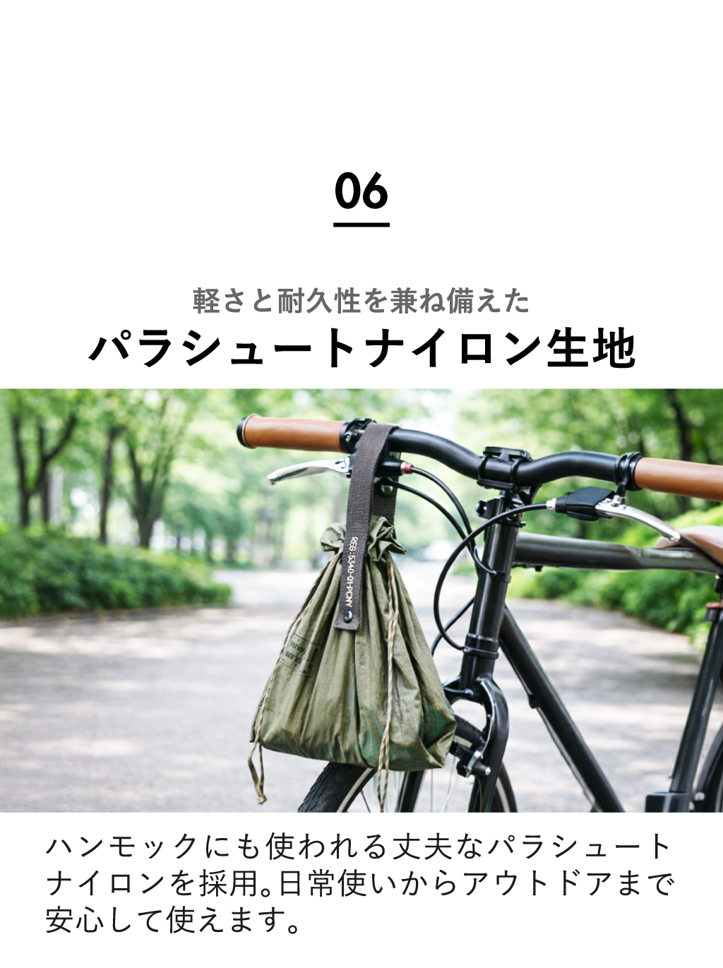 素材にはハンモックにも使用されるパラシュートナイロンを採用。