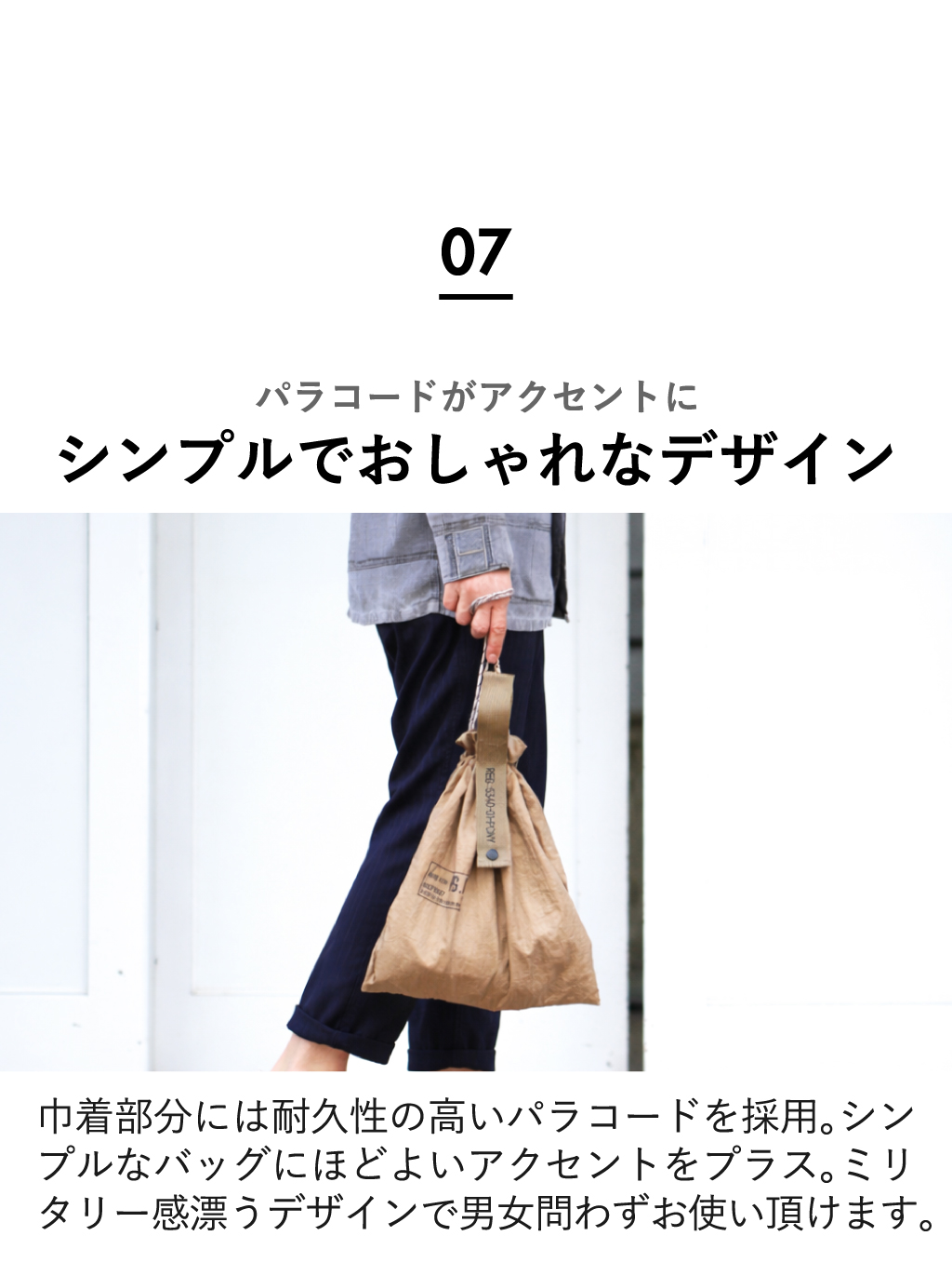 さらに、巾着部分にはパラコードを使用し、デザインのアクセントに。