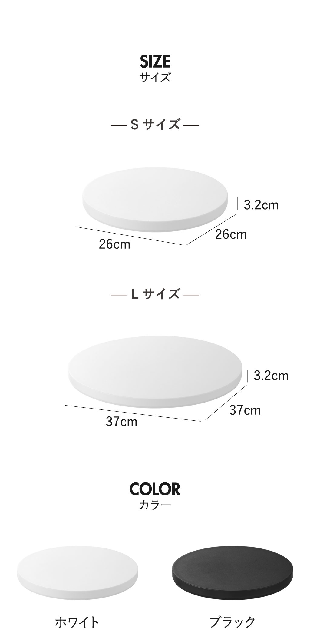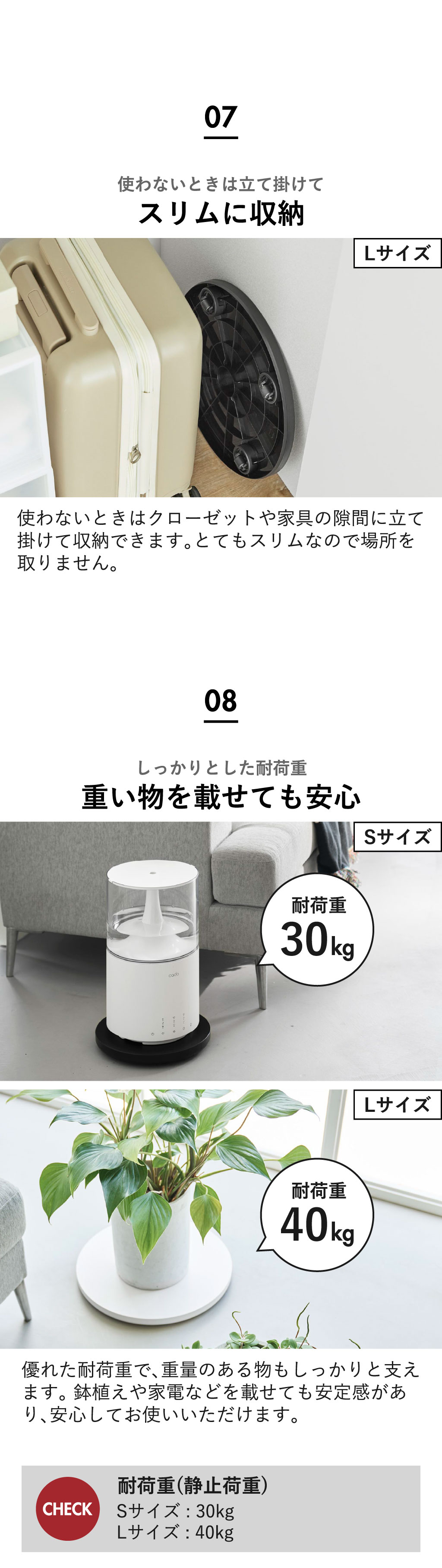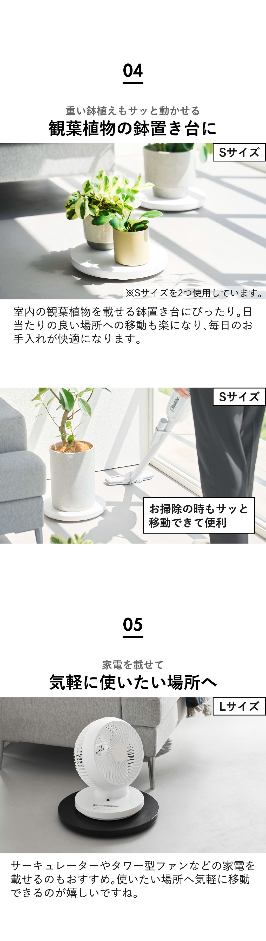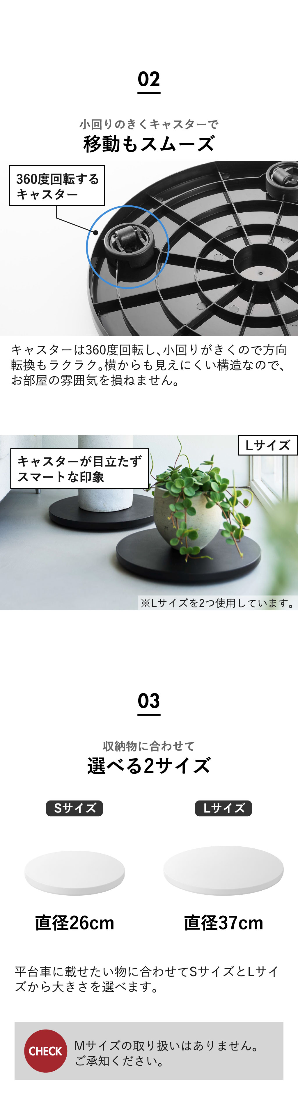 Sサイズは小さいフォルムで場所を取らず、Lサイズは大きめの家電も載せやすいサイズ感です。