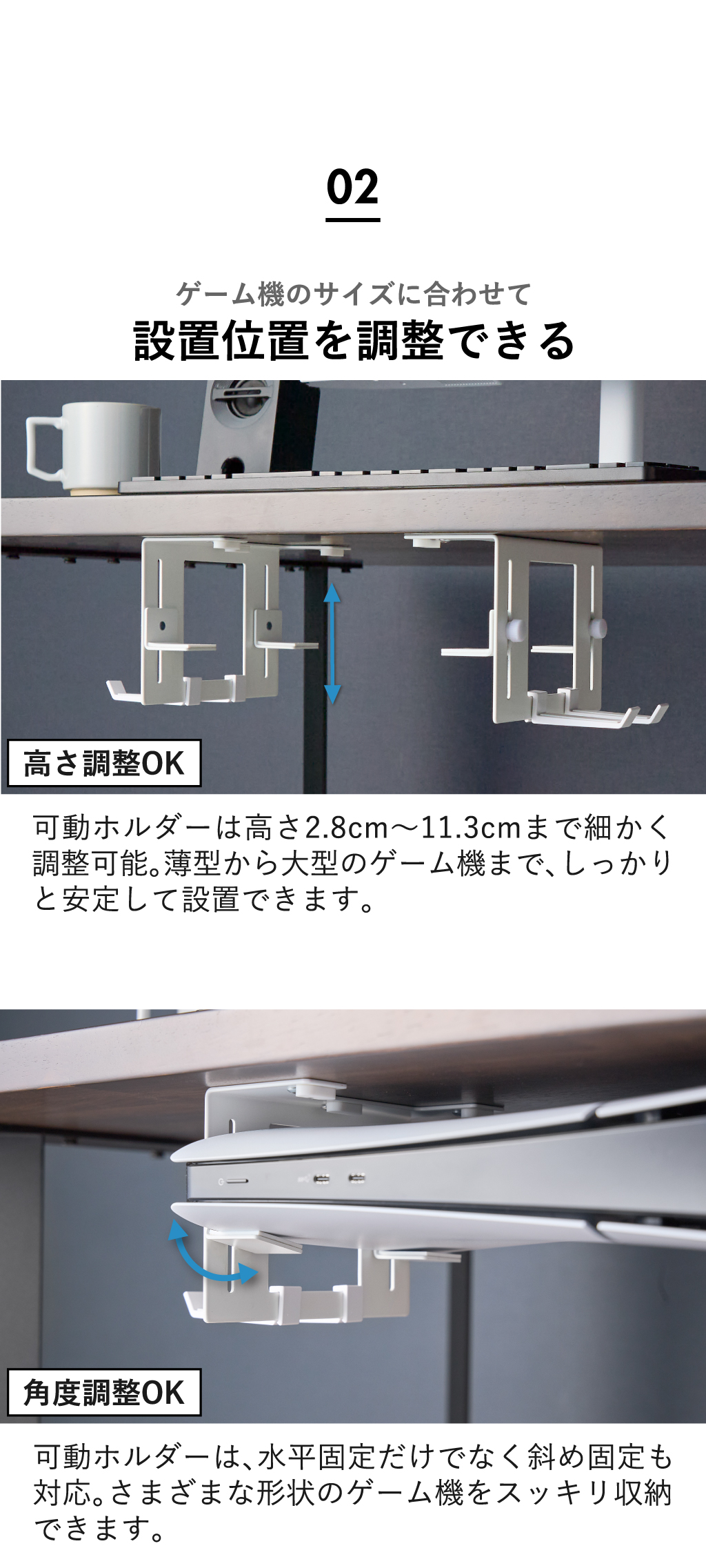 可動式の固定ホルダーは斜めにも固定できるので、さまざまな形状のゲーム機に対応します。