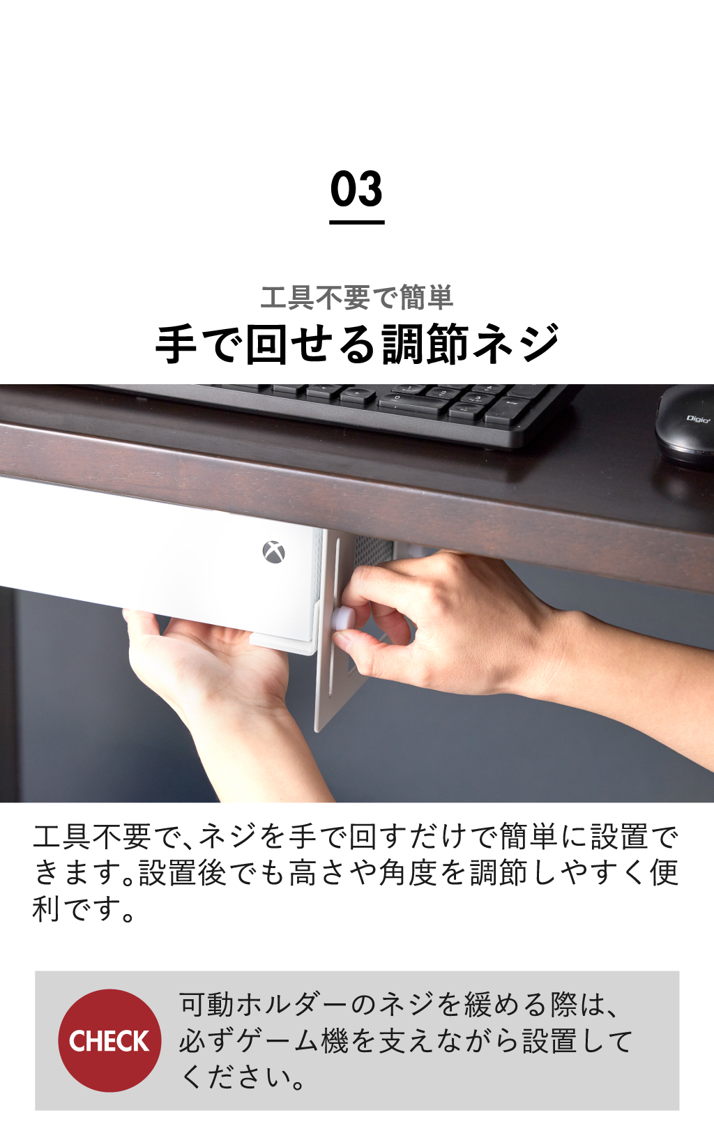 手で回せる調節ネジを採用しているため、設置する本体のサイズに合わせてスムーズに微調整可能。
