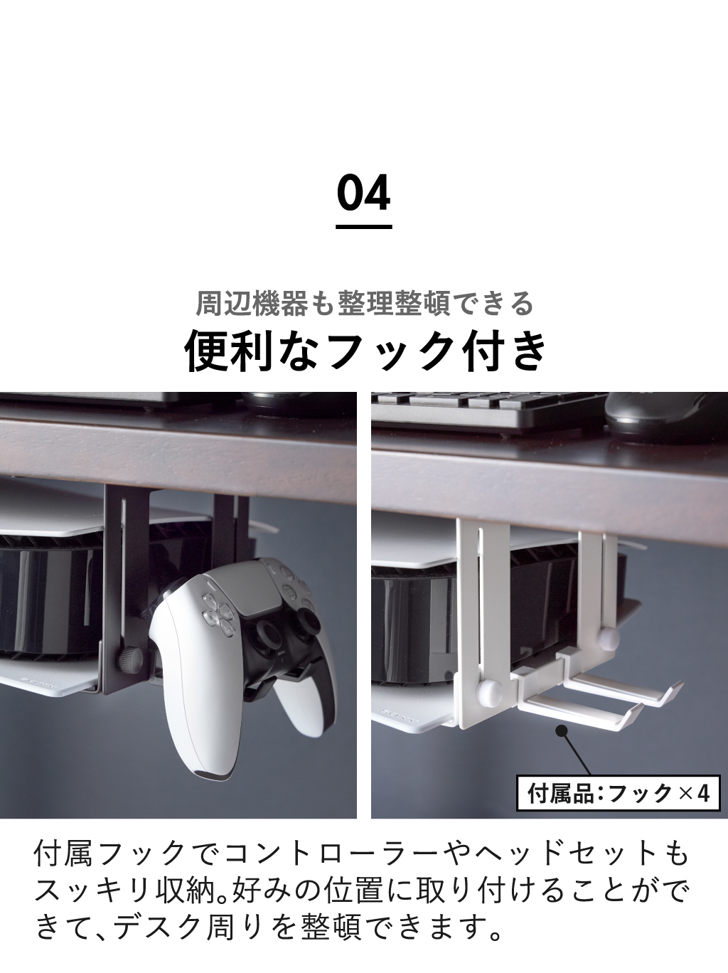 付属のフックはお好みの位置に取り付けられ、コントローラーやヘッドセットもまとめて収納できます。