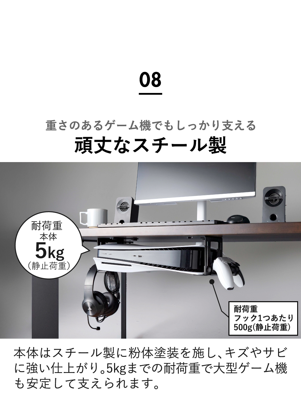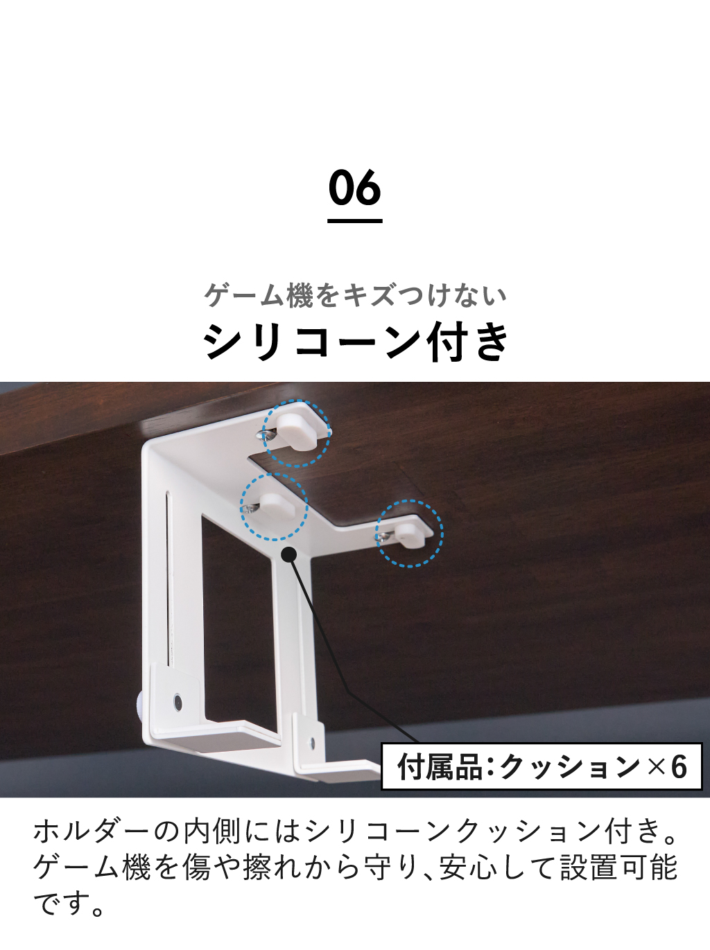 フック1つあたり500g(静止荷重)で、重さのあるゲーム機にも対応。