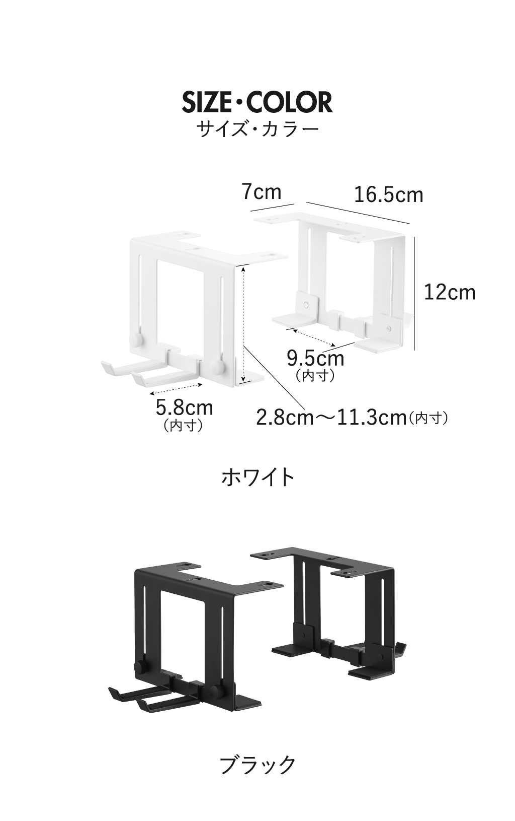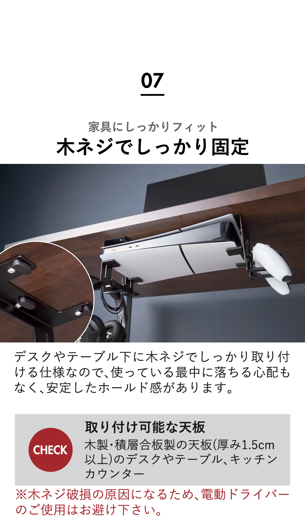 デスクやテーブル、キッチンカウンター下に木ネジでしっかり取り付けられる仕様です。