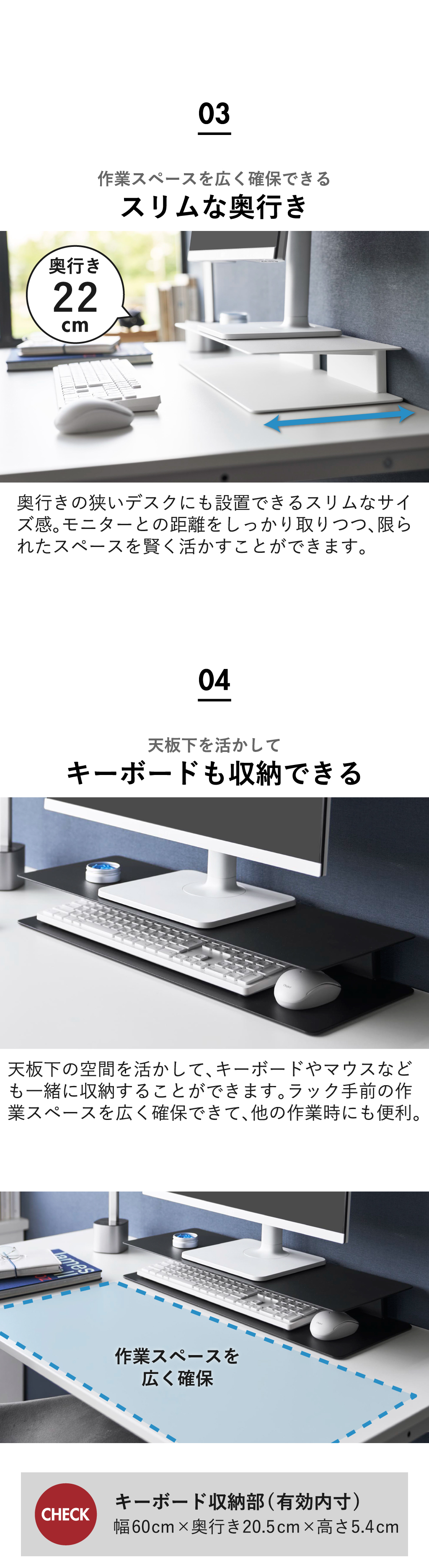 パソコンモニターとの距離をしっかり取りつつ、限られたスペースを賢く活かせます。