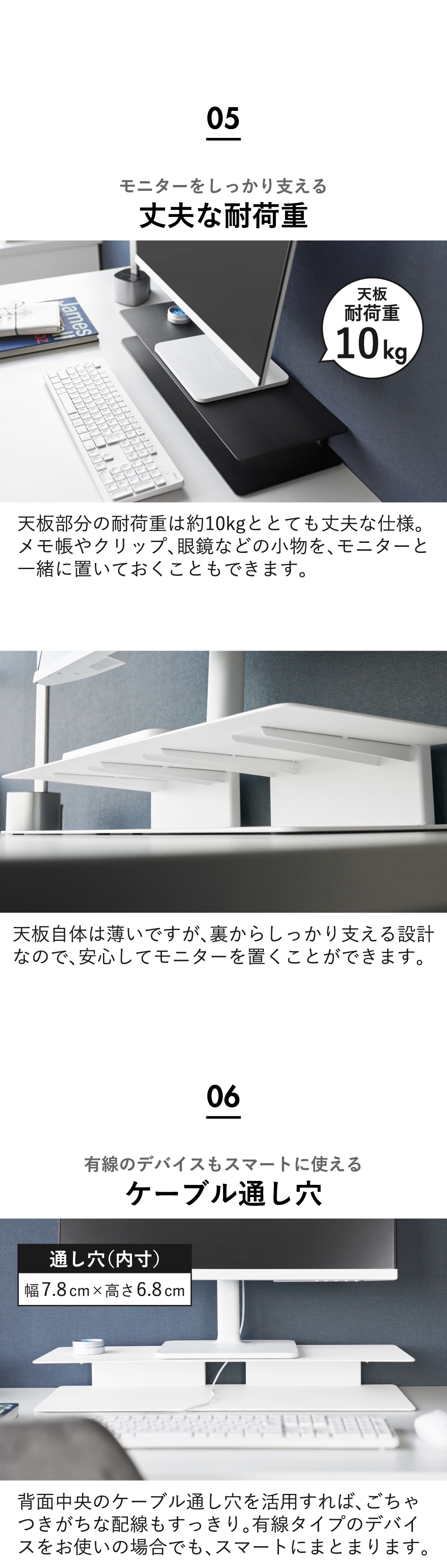 天板部分の耐荷重は約10kgと、とても頑丈な仕様のモニターラック。