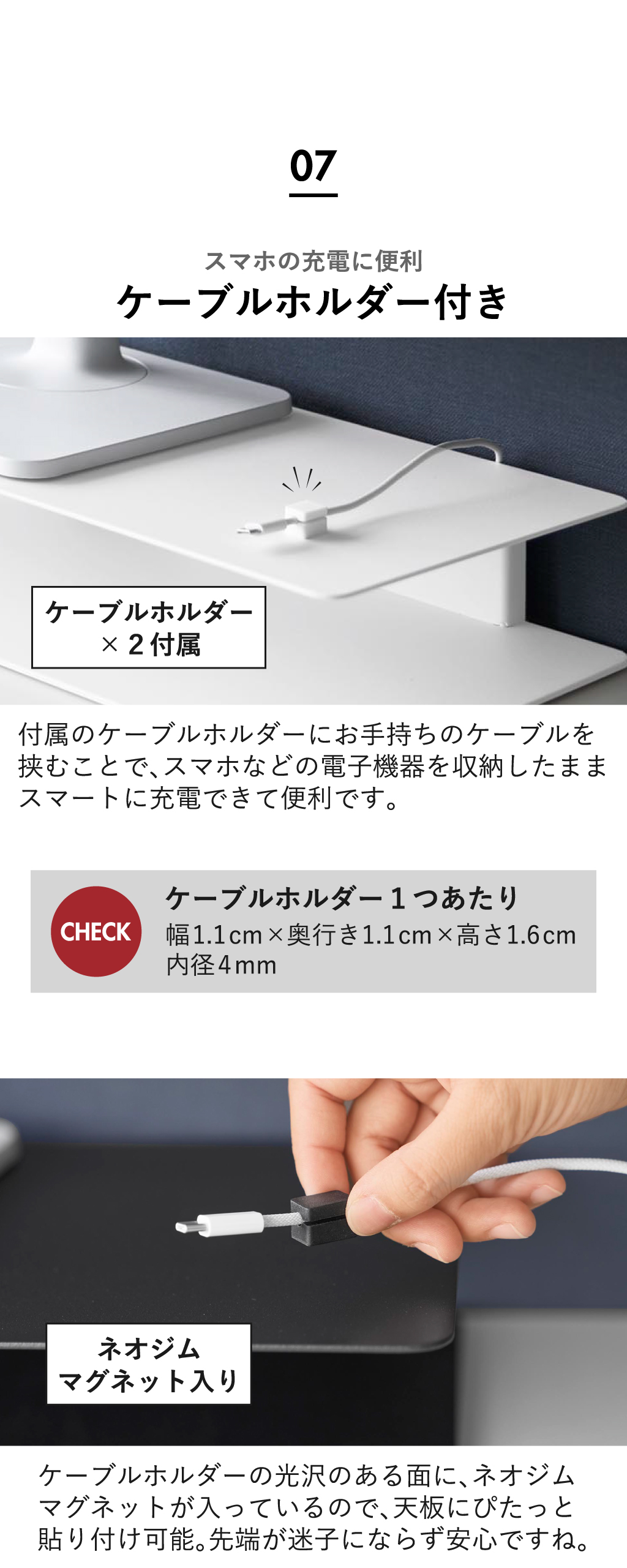 モニター台のケーブルホルダーには、ネオジムマグネットが付いているので、