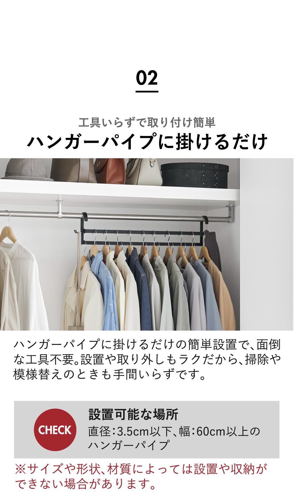 工具不要でハンガーパイプに掛けるだけの簡単設置。