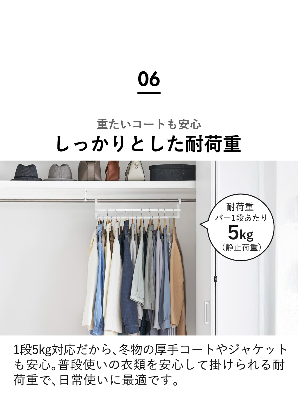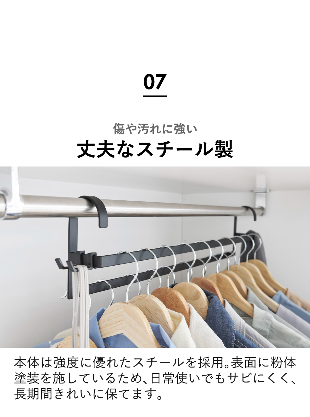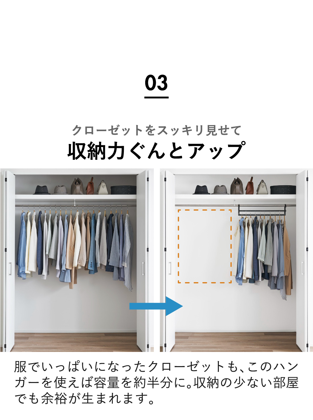 ぎっしり詰まったクローゼットに空きスペースを生み出し、効率的な洋服収納を実現します。