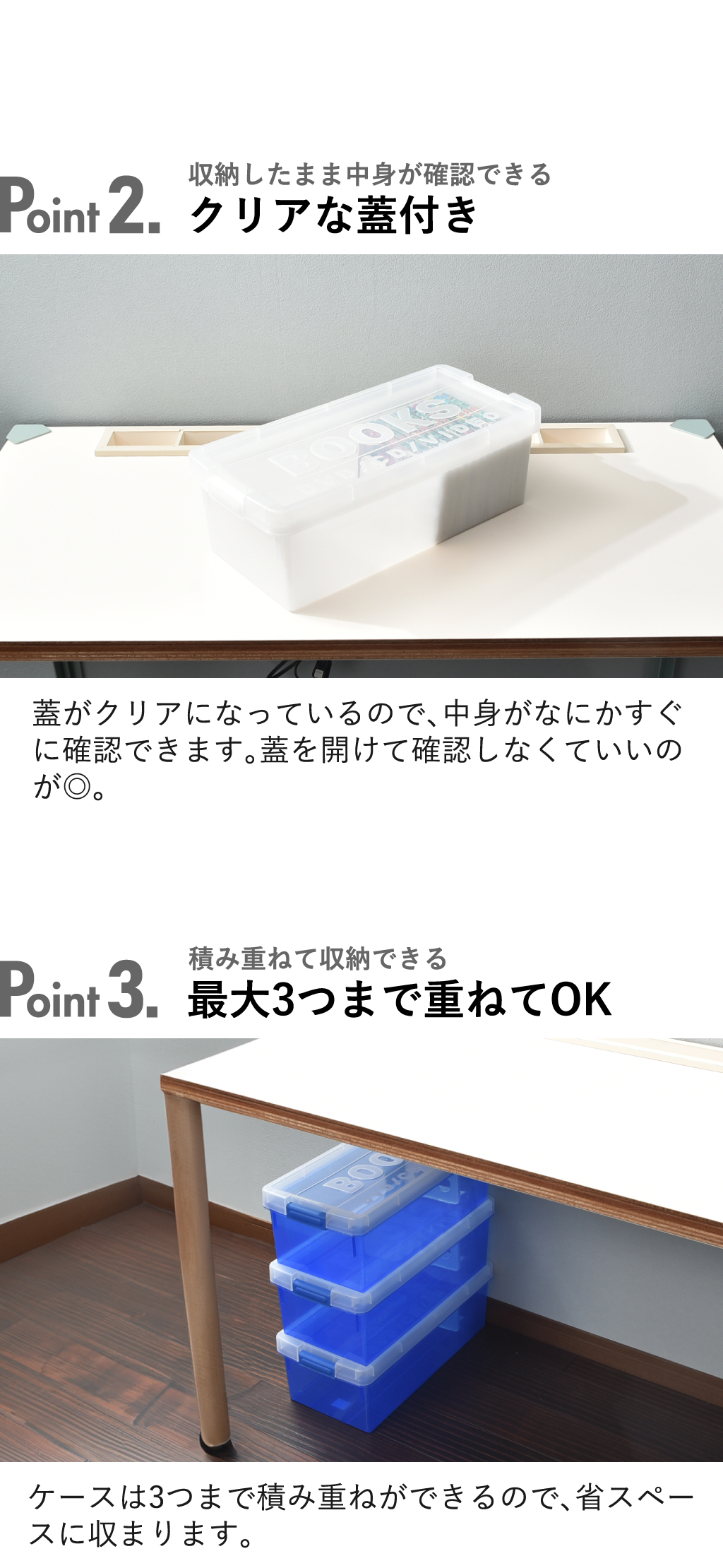 クリアケースを複数買えば、積み重ね収納ができます。