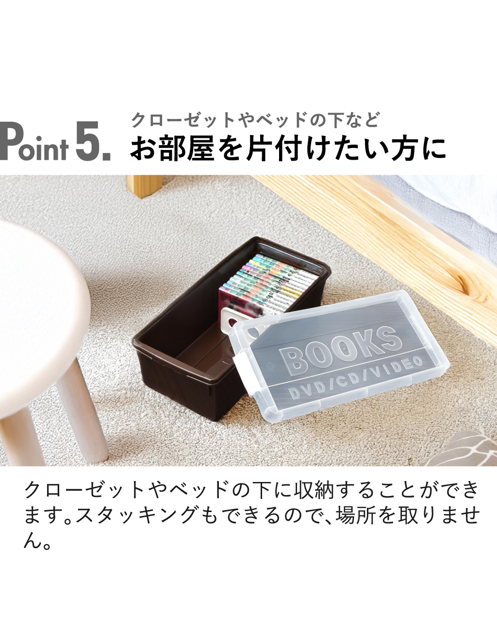 本収納ボックスをラックやベッドの下などに隙間収納でき、部屋が片付きます。