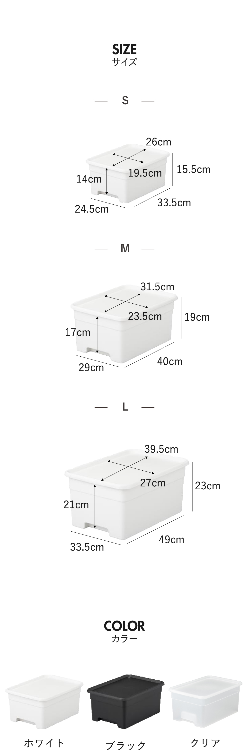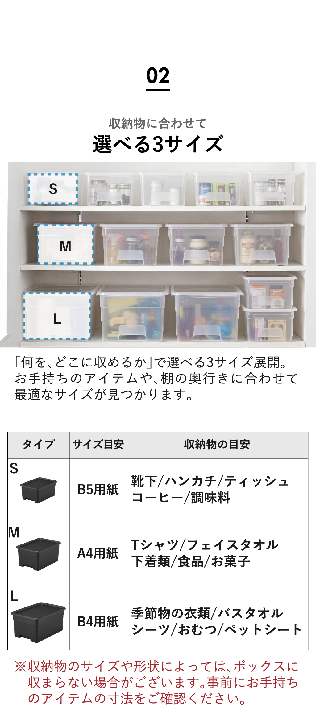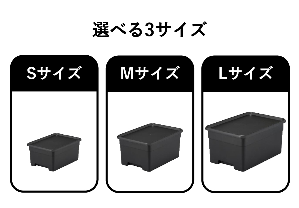 サイズは全部で3種類。収納物に合わせて選べるので、用途に最適な収納ボックスを見つけることができます。