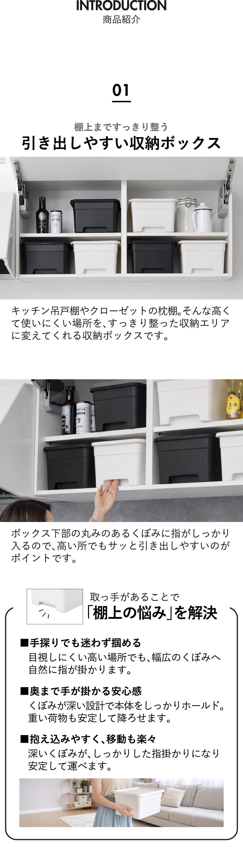 このクローゼット収納ケースは、下部の丸みのあるくぼみに指がしっかり入るため、高い所からでもサッと取り出しやすいのがポイント。