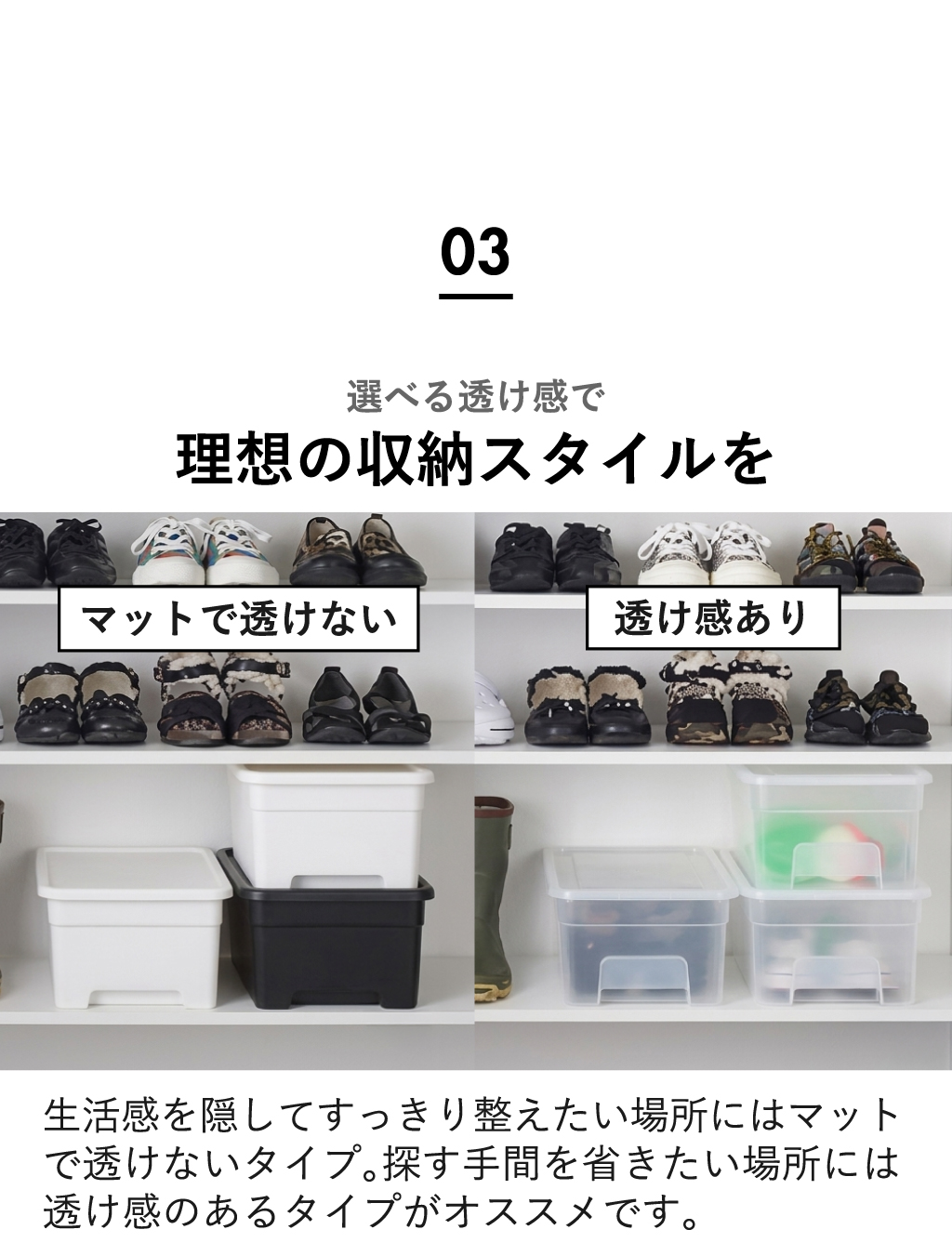 生活感を隠したい方にはマットで透けないタイプ、探す手間を省きたい方には中身が見えるクリアな収納ボックスがオススメです。