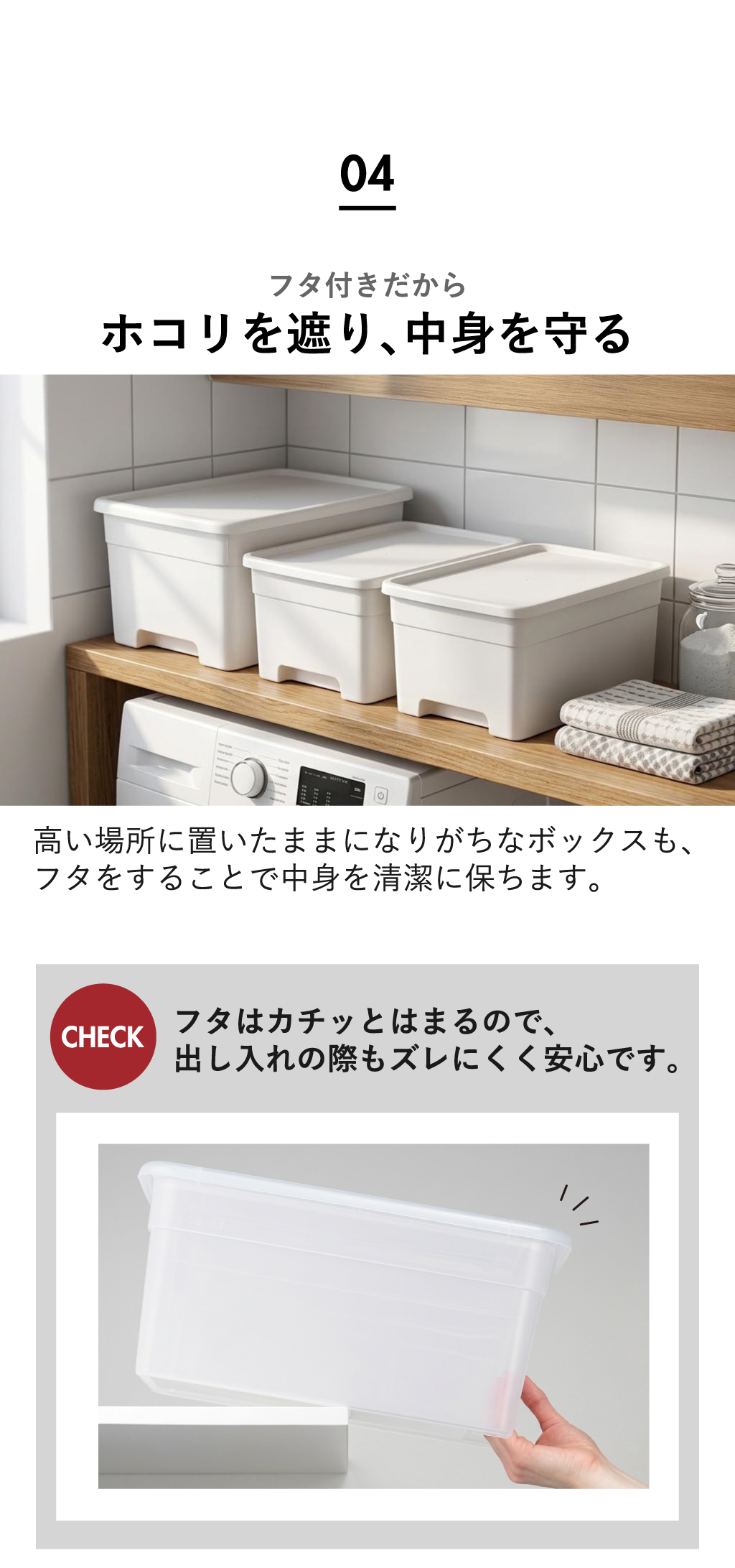 カチッと閉まるフタはホコリを防ぐだけでなく、収納ボックスを棚上から引き出す際もズレにくく安心です。