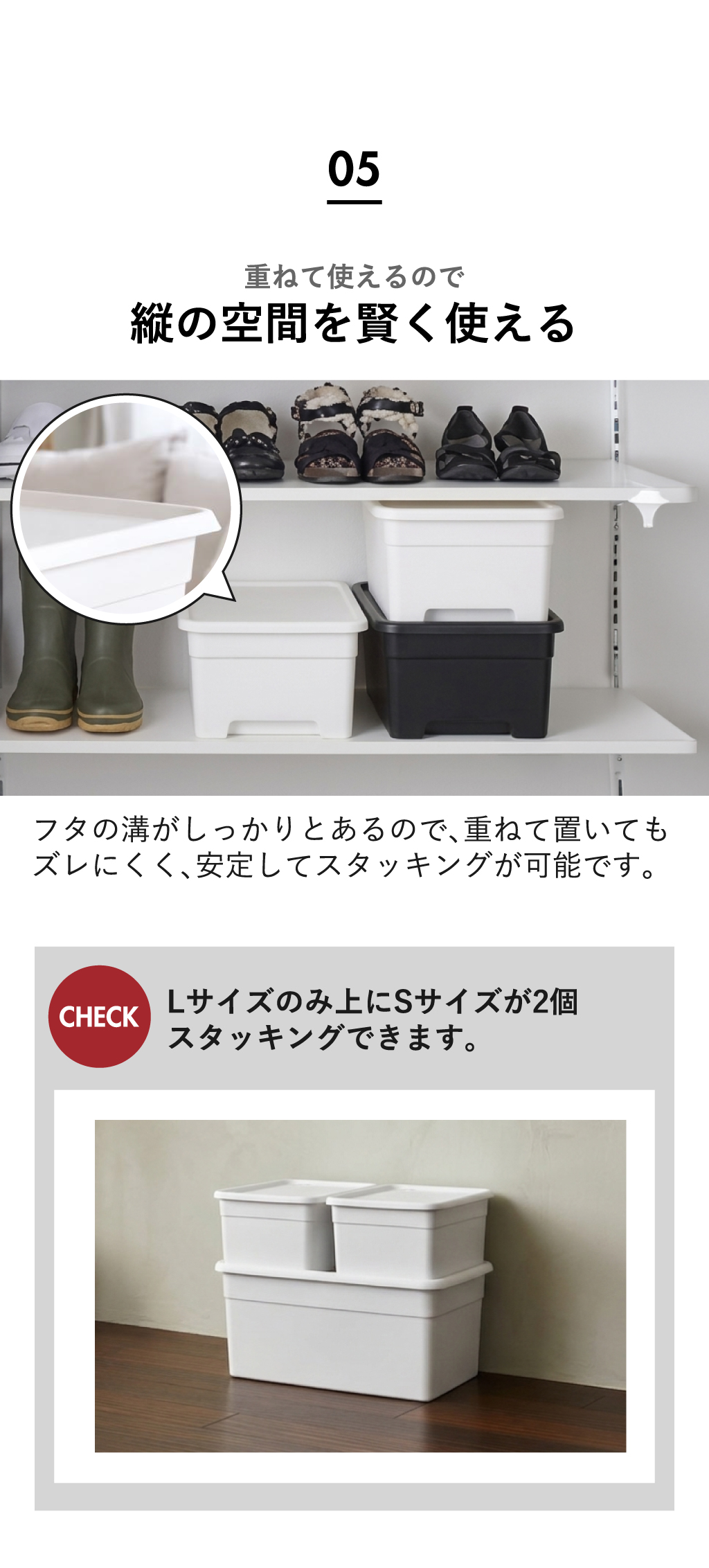 また、クローゼット収納ケースのフタには溝があるため、収納ボックスをスタッキングした際もズレ落ちる心配がありません。