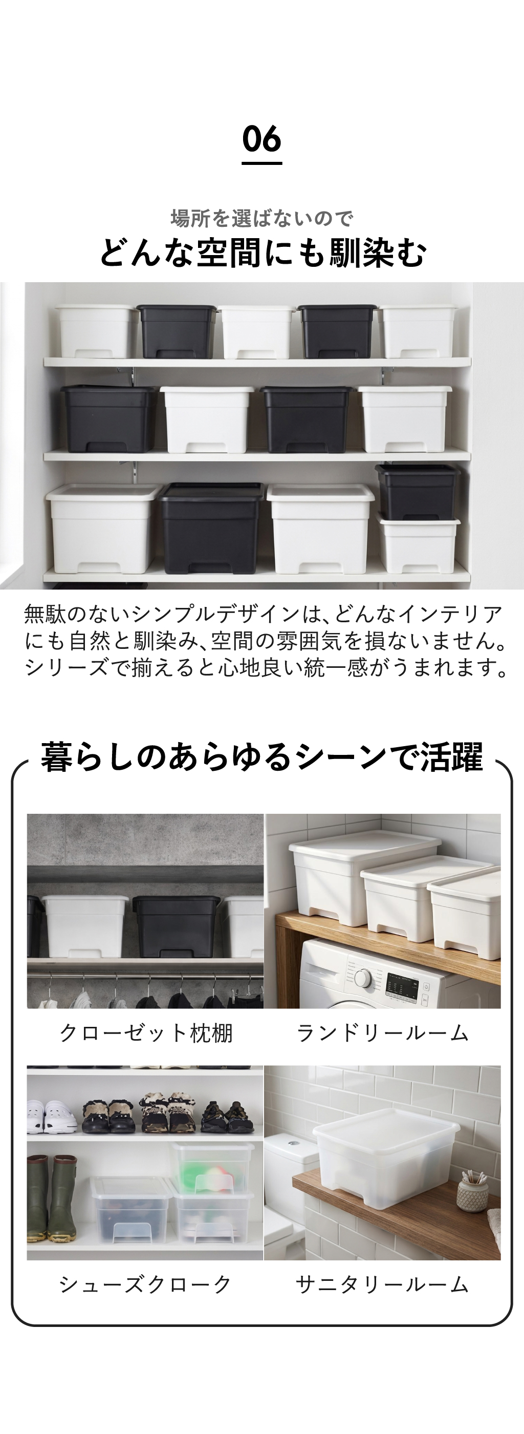 無駄のないシンプルデザインの収納ボックスは、どんなインテリアにも自然と馴染み、暮らしのあらゆるシーンで活躍します。