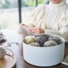 天然木のフタは裏返してトレーとして使用できます。裁縫道具の収納時にはボタンや糸などの一時置きに。包装されたお菓子を配るときに活用するのも便利です。