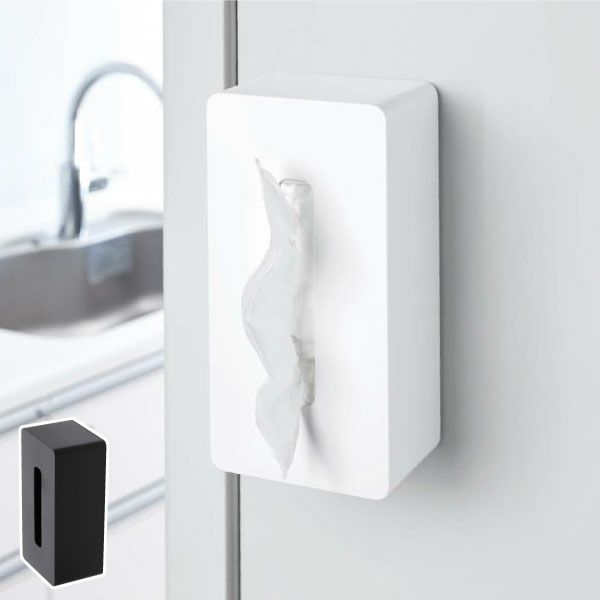 冷蔵庫や洗濯機にぴたっと貼れるマグネット付きティッシュケースです。テーブルの上に置くと場所を取りがちなティッシュボックスを、すっきりスマートに壁面に収納可能。シンプルなデザインが様々なインテリアに馴染み、空間をよりおしゃれに演出。色はホワイトとブラックの2色からお選びいただけます。